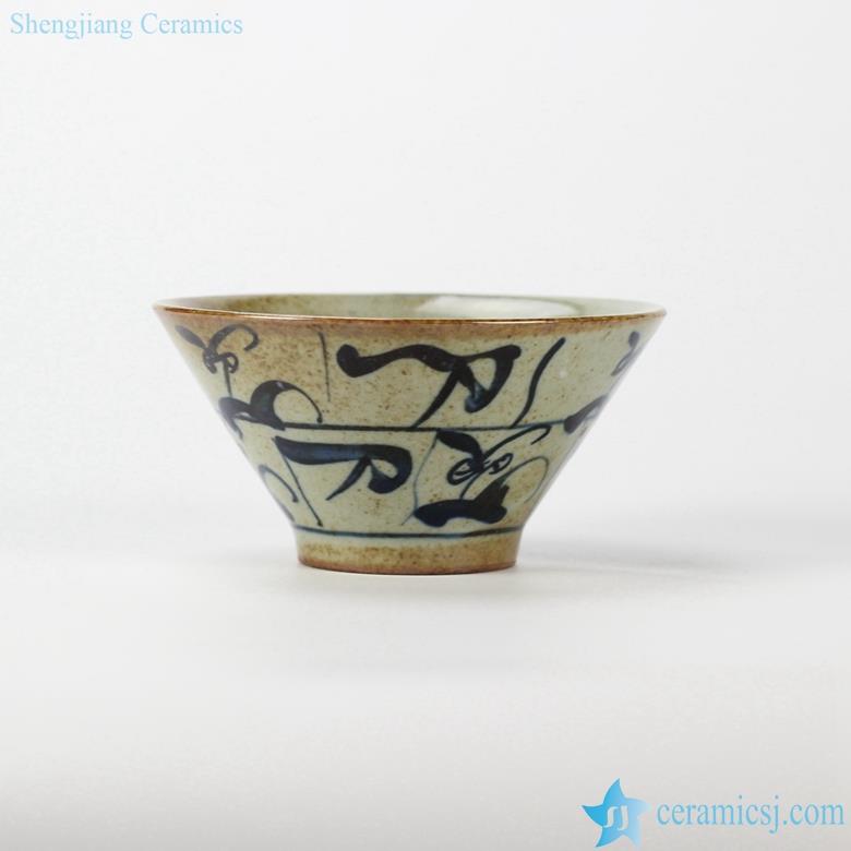 Crude clay material hand paint blue and white Chinese calligraphy old style ceramic soup bowl