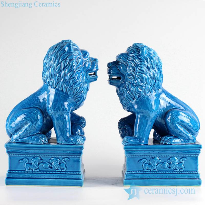 China gate warrior blue ceramic squat lions statues book end