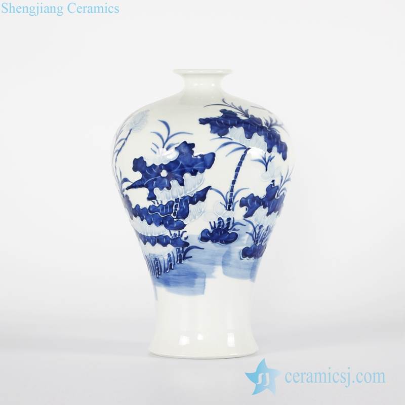 Jingdezhen wholesale price blue and white relief lotus pattern porcelain Meiping vase