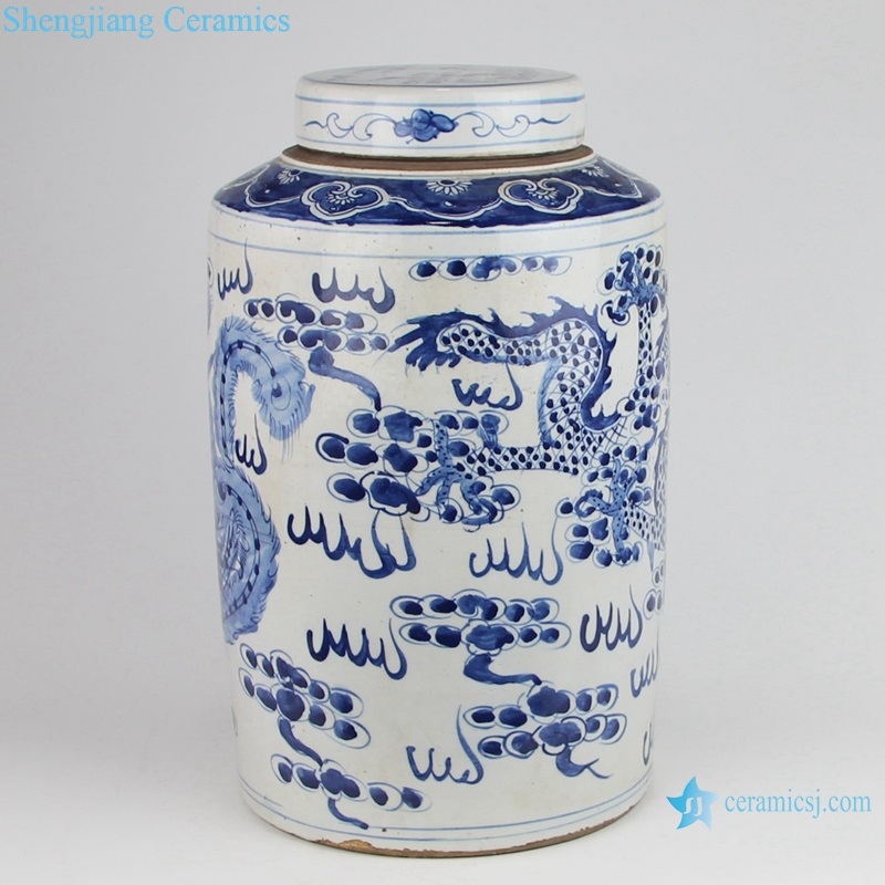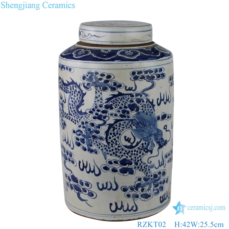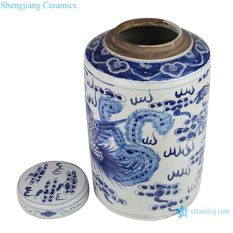 RZKT02 Archaid-style hand-painted blue and white cloud dragon and phoenix patterns with lid tea canister