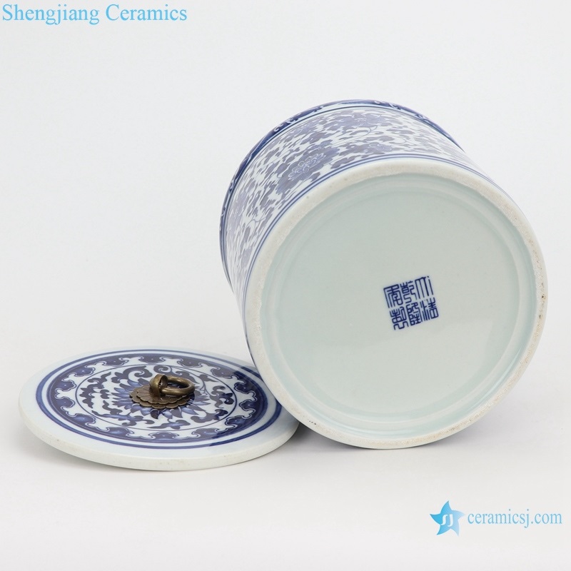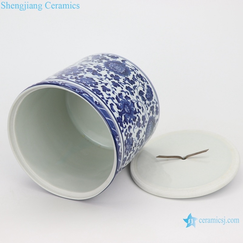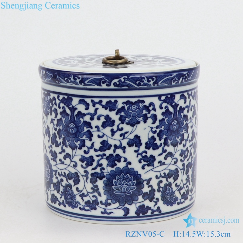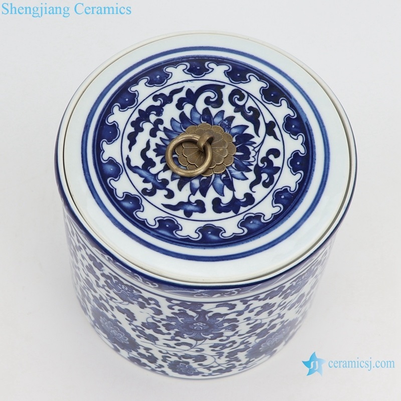 RZNV50-A-L Traditional blue and white lotus pattern with a copper ring lid round straight tube tea can of large size