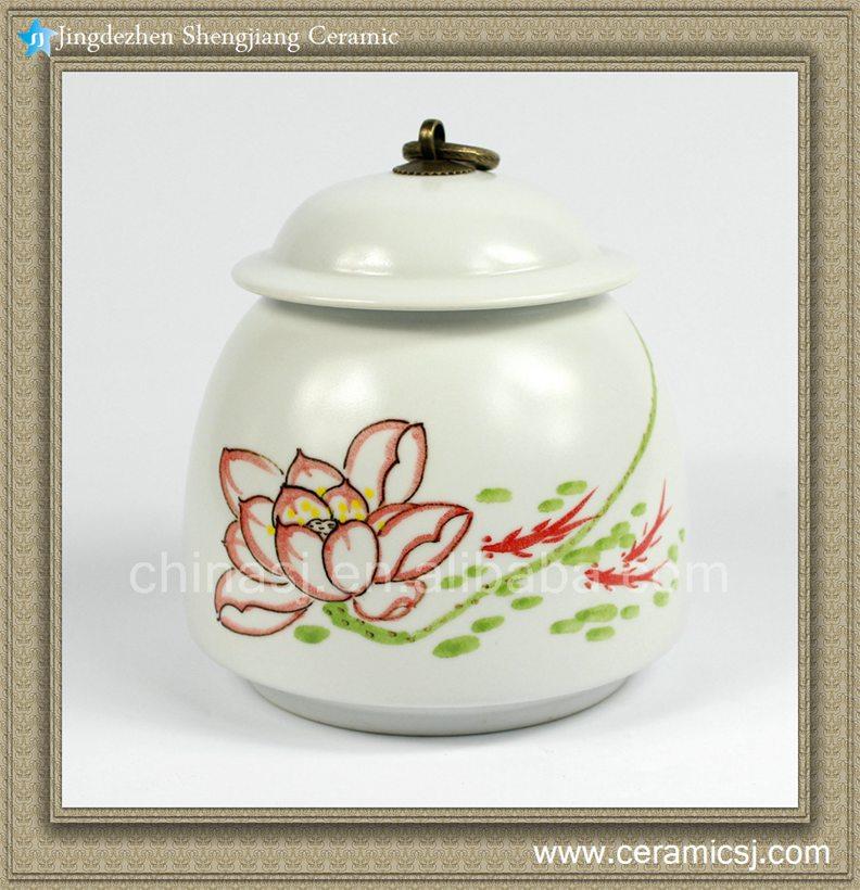 | Description: | Semi matte Tea Jar, hand painted with a metal ring, high temperature fired |