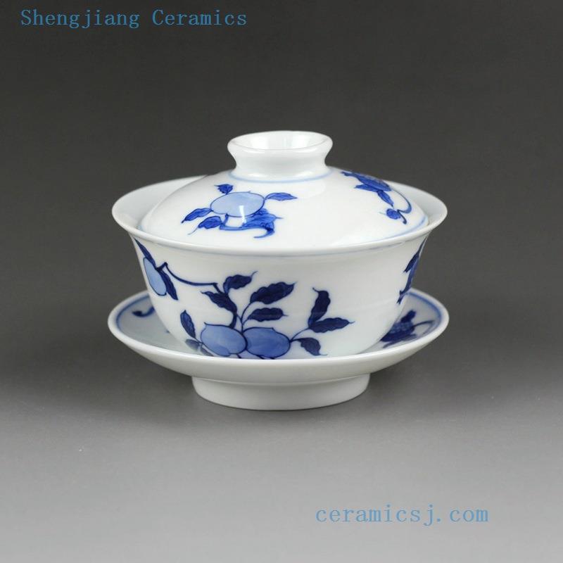 Jingdezhen hand made painted blue white porcelain Gaiwan, floral, butterfly, squirrel, peach, Beijing opera face design |