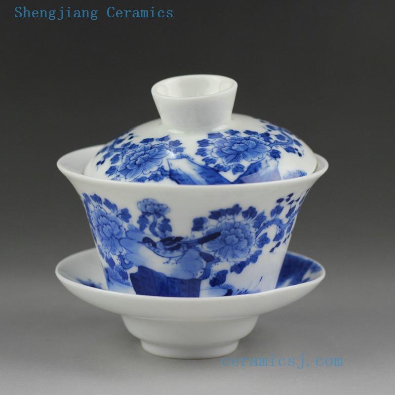 Jingdezhen hand made porcelain blue white Gaiwan, floral, bird, figurine design |