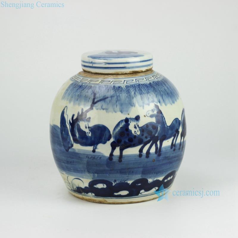 Hand paint blue and white horse pattern lidded urn