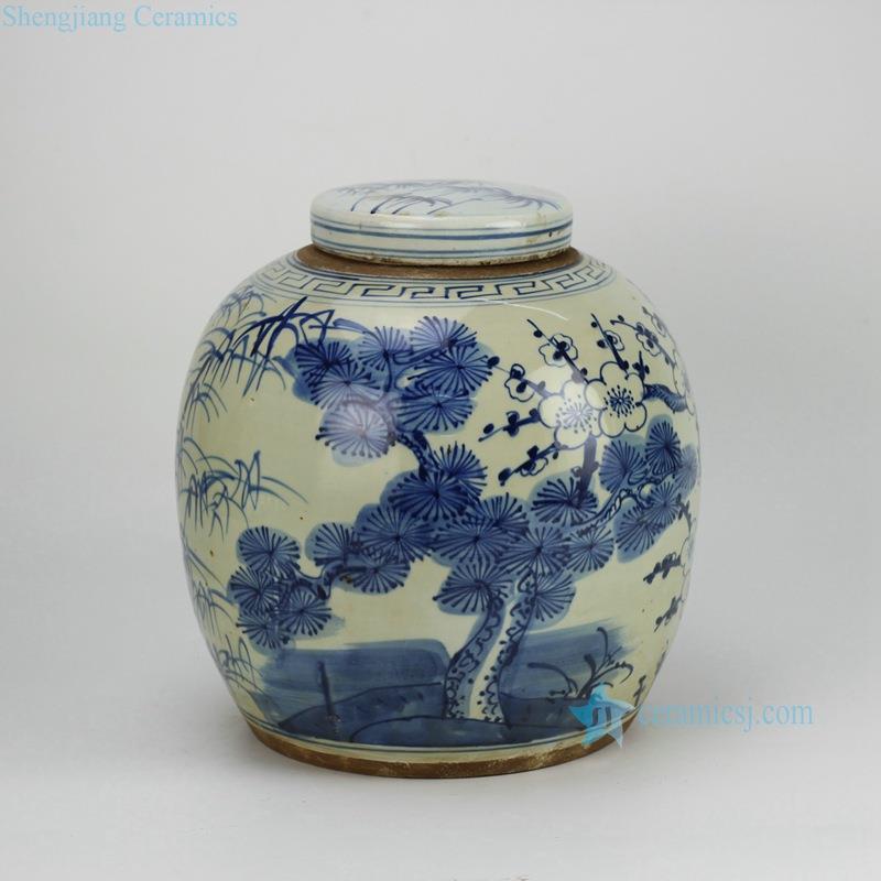 three durable plants of winter — pine , bamboo and plum blossom pattern hand paint blue and white antique porcelain jar