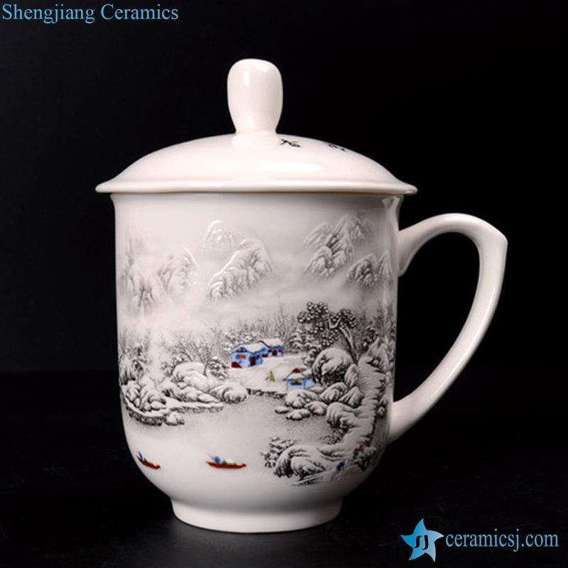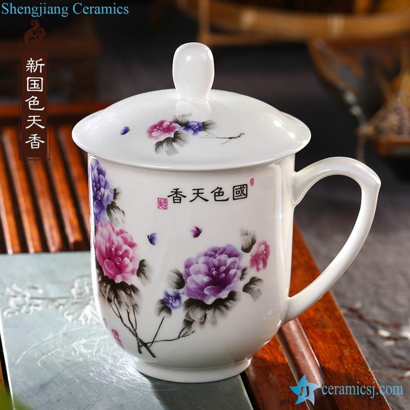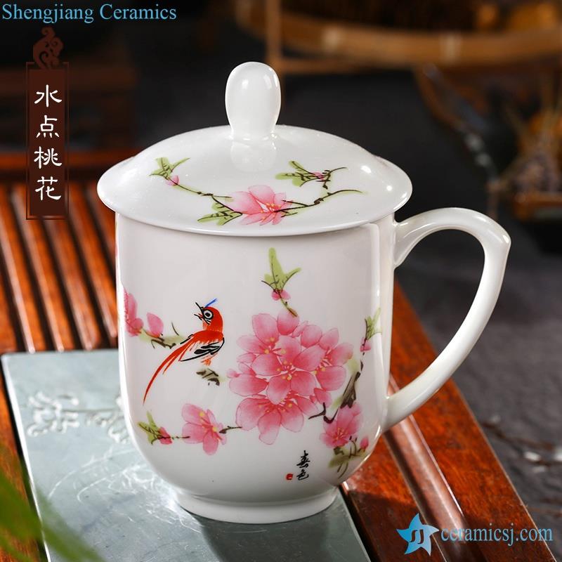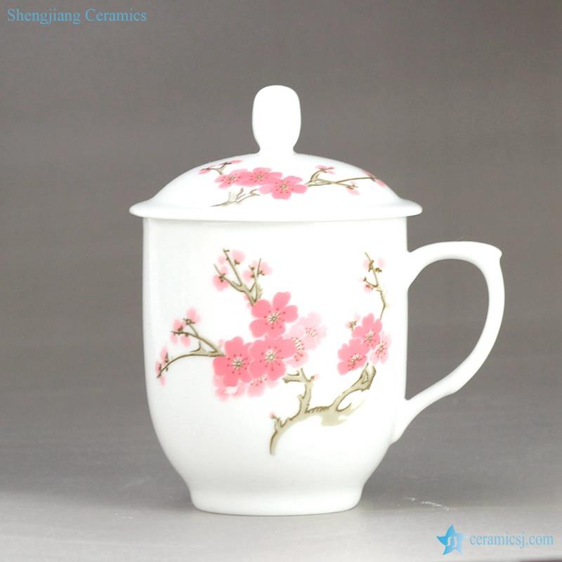 400cc Pink plum blossom mark hot sale Chinese promotional healthy porcelain water cup with lid and handle