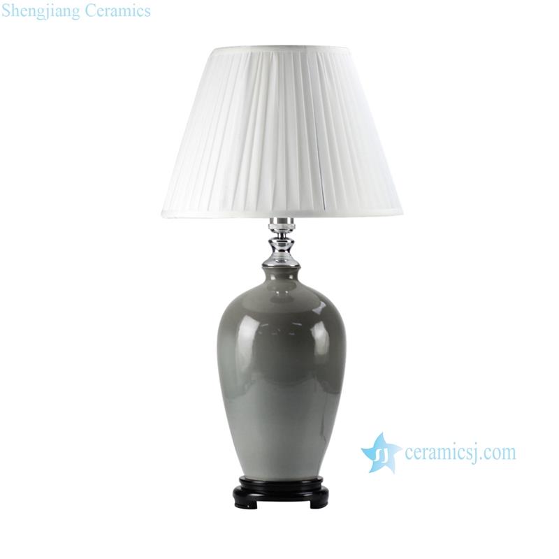 Jingdenzhen China produce grey solid color glaze ceramic modern lamp with wooden base and pleated fabric lamp shade