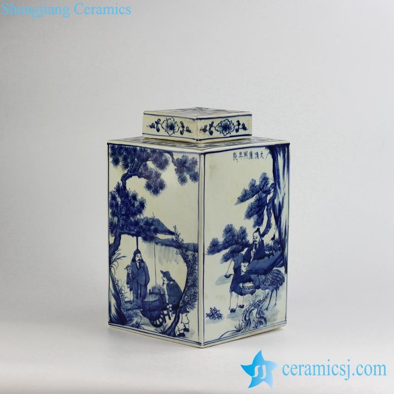 Qing Dynasty Kangxi Emperor era reproduction hand paint ancient Chinese farming life pattern ceramic square blue and white jar