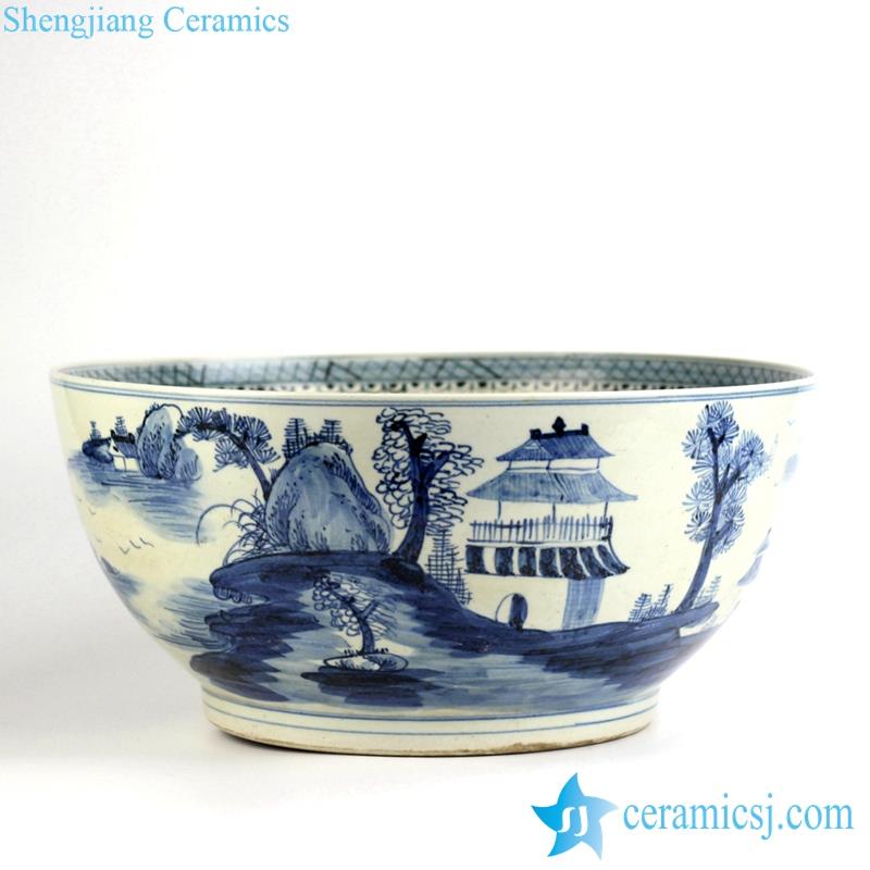 Blue and white hand paint airy pavilions and pagodas pattern plump ceramic bowl