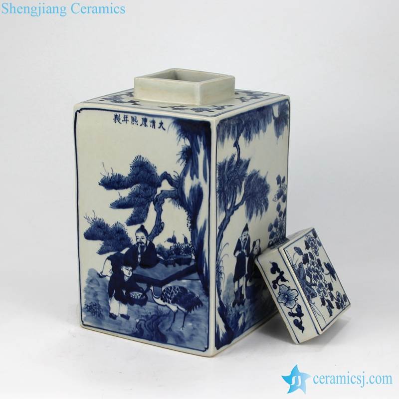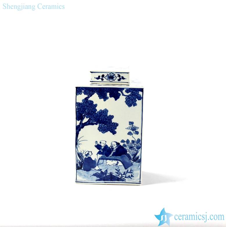 Hand painted in cobalt and white father children pattern square cookie jar |