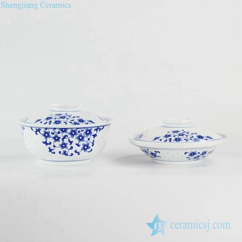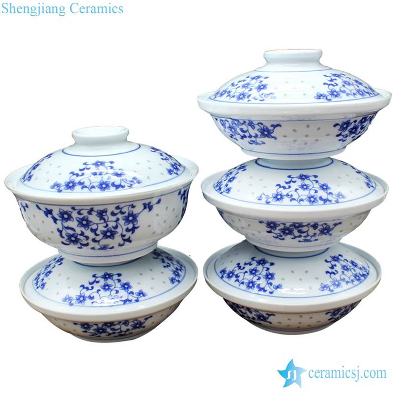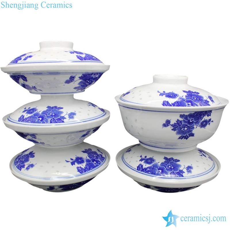 Blue and white transparent rice pattern household daily use ceramic tureen |