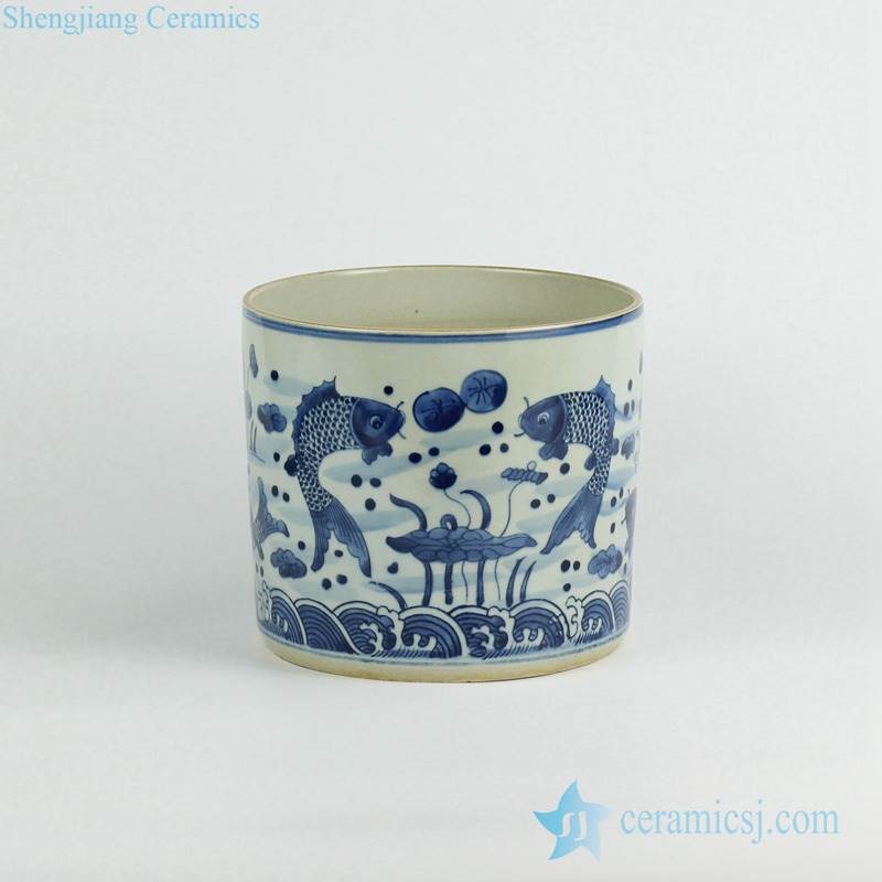 Double carp pattern vintage hand paint blue and white tubular ceramic vase
