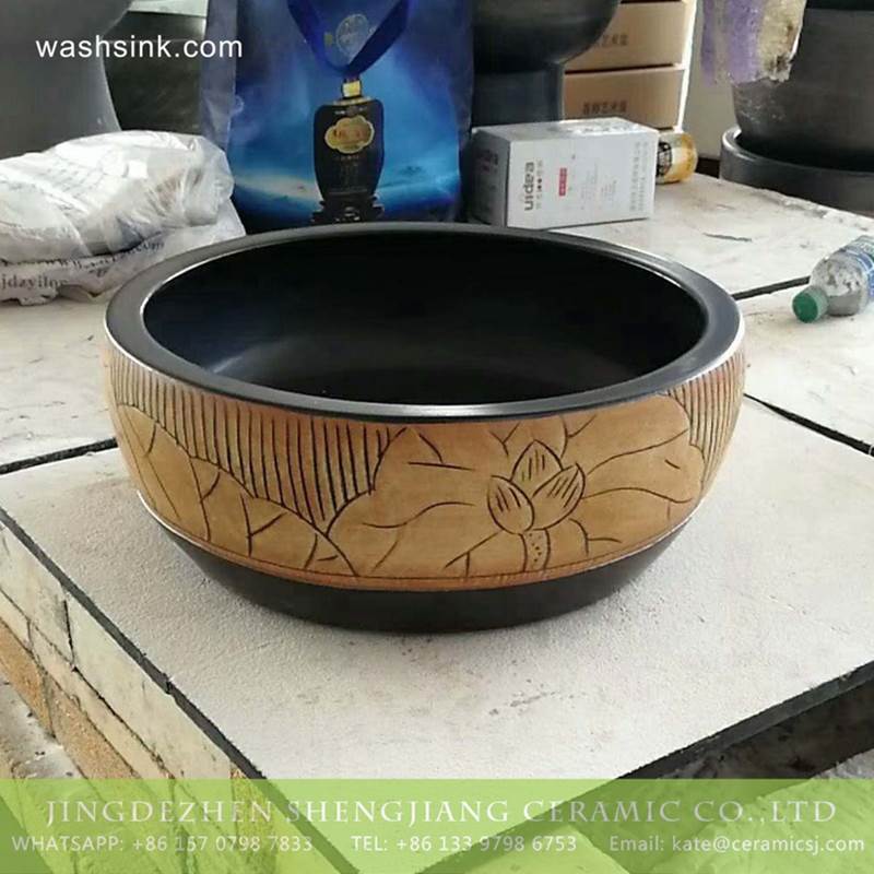 Jingdezhen made China style hand carved lotus pattern black wall mounted porcelain washbasin