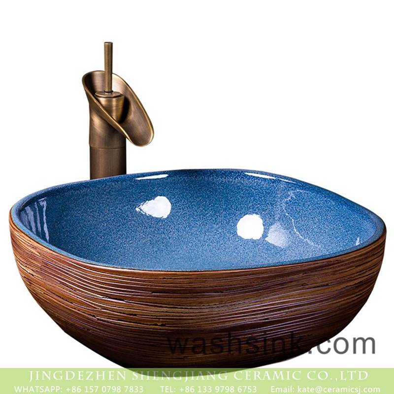Factory wholesale price art ceramic dark blue wall and the wood color surface vanity basin