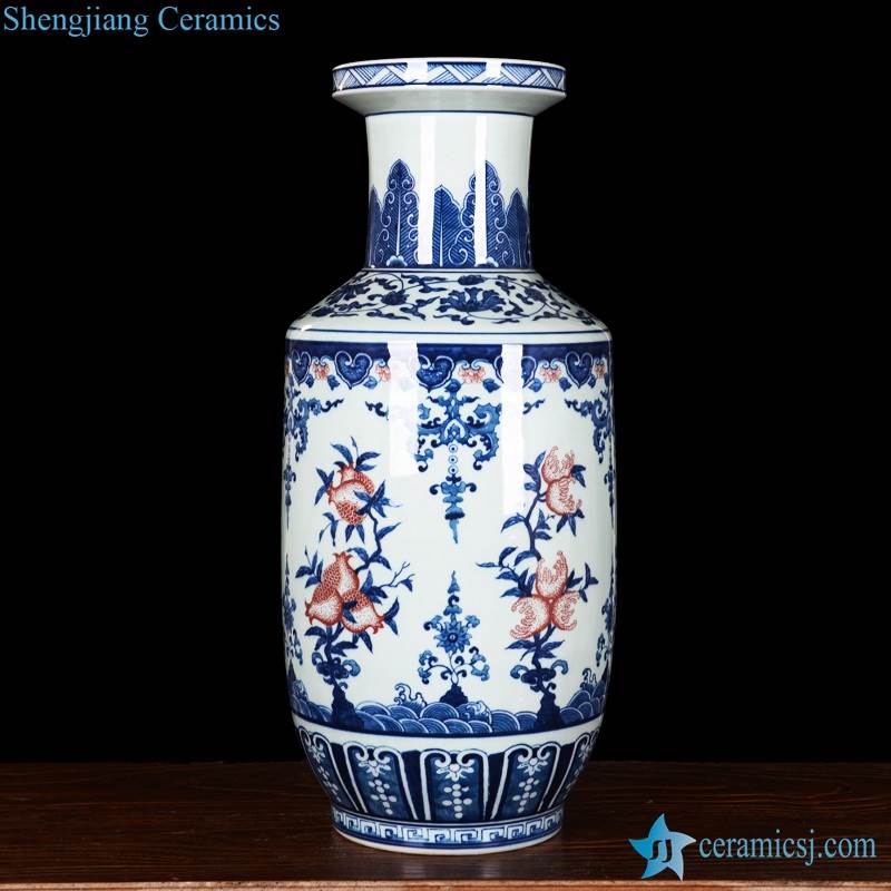Cobalt blue and under glaze red pomegranate pattern home decor flat ceramic flower vase