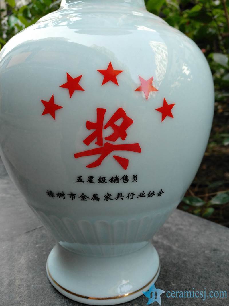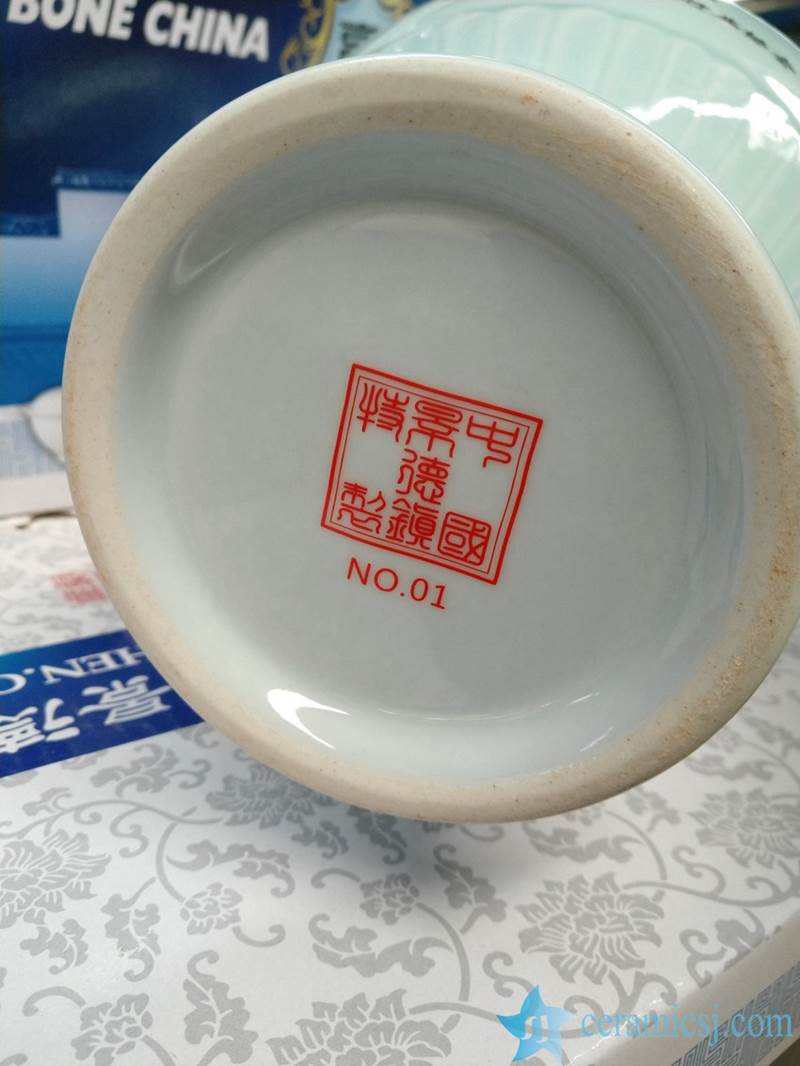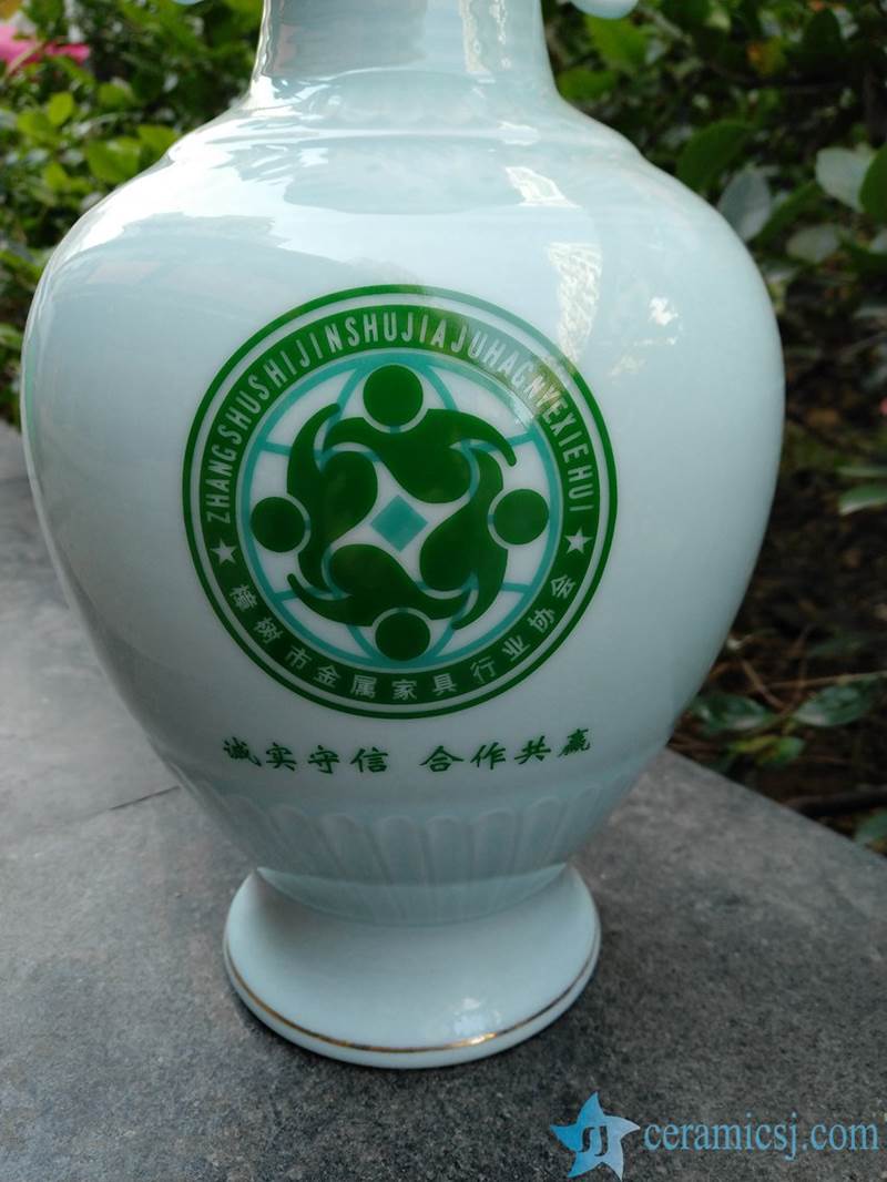 Shengjiang Ceramics designer put the logo of Metal Furniture Industry Association of Zhangshu city on the belly part of celadon vase. And the bottom of the vase is Made in Jingdezhen China stamp. Top and bottom rim of the celadon vase are plated with golden line to make the vase more delicate.