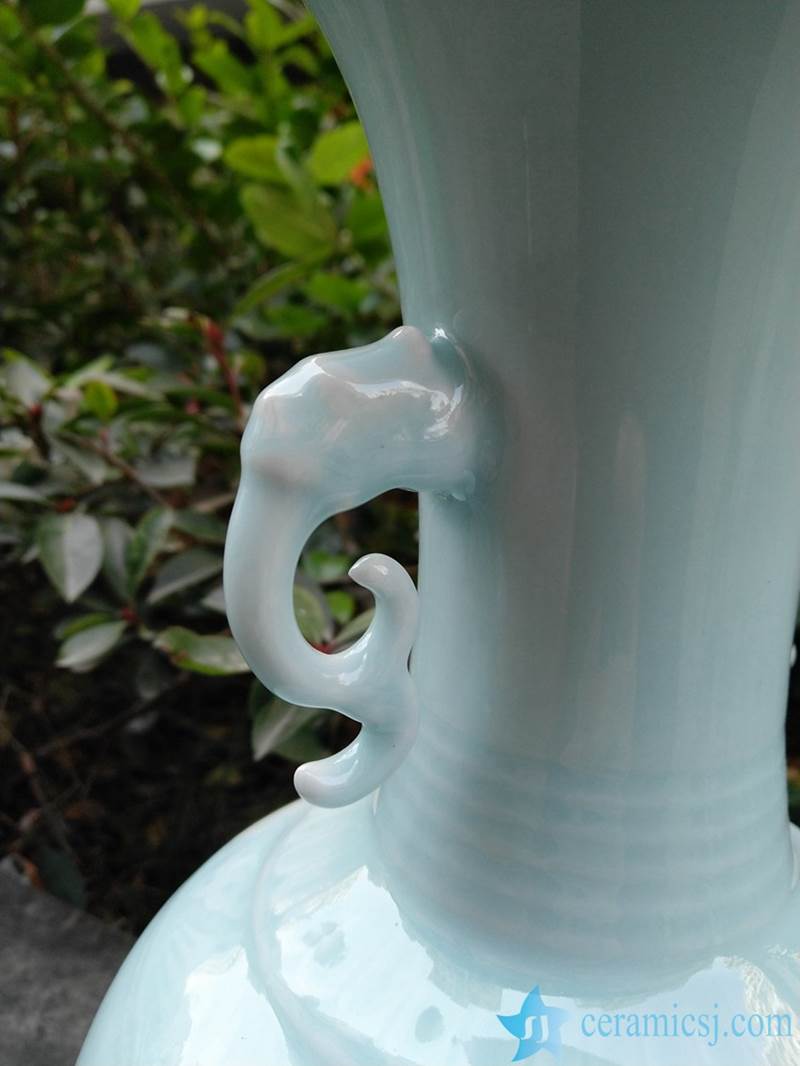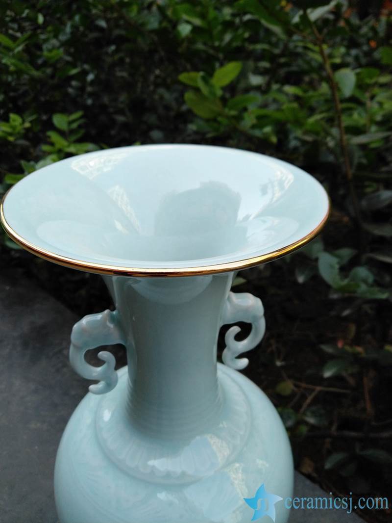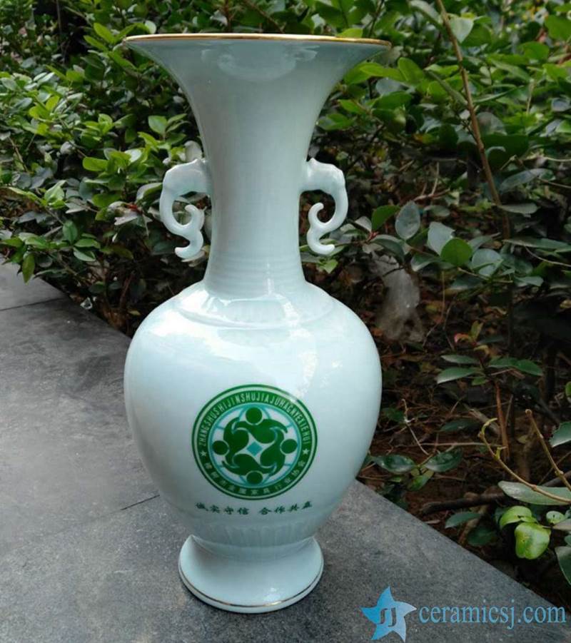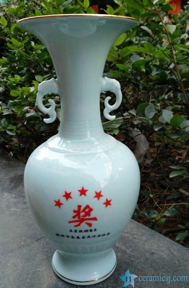 Shengjiang Ceramics manager suggest a celadon glaze light green porcelain vase to mayor. The vase is wide open top like a trophy and with two dragon ear for easy holding.