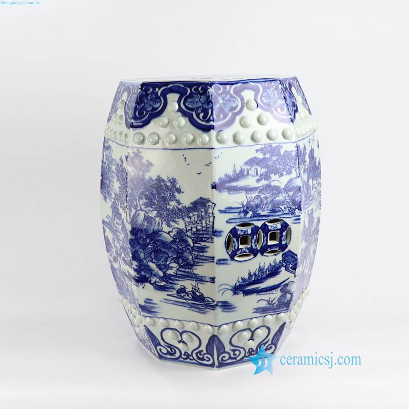 Blue and white China river side life six faces ceramic stool |