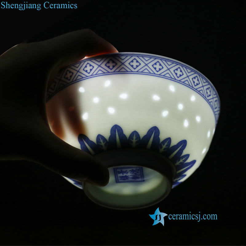 Linglong porcelain(rice hole pattern porcelain) is also called “rice flower”, the Japanese called “Mitong”, and the Westerners call it a glass-embedded porcelain.” It uses iron carving technique to first make a certain shape of exquisite eyes on the porcelain body, with special decoration. Linglong glaze fills the eyes, and then draws blue and white, and glazes and burns at high temperature. The blue and white enamel is decorated with exquisite, quiet and elegant, simple and generous artistic features, giving people a fresh and bright feeling.