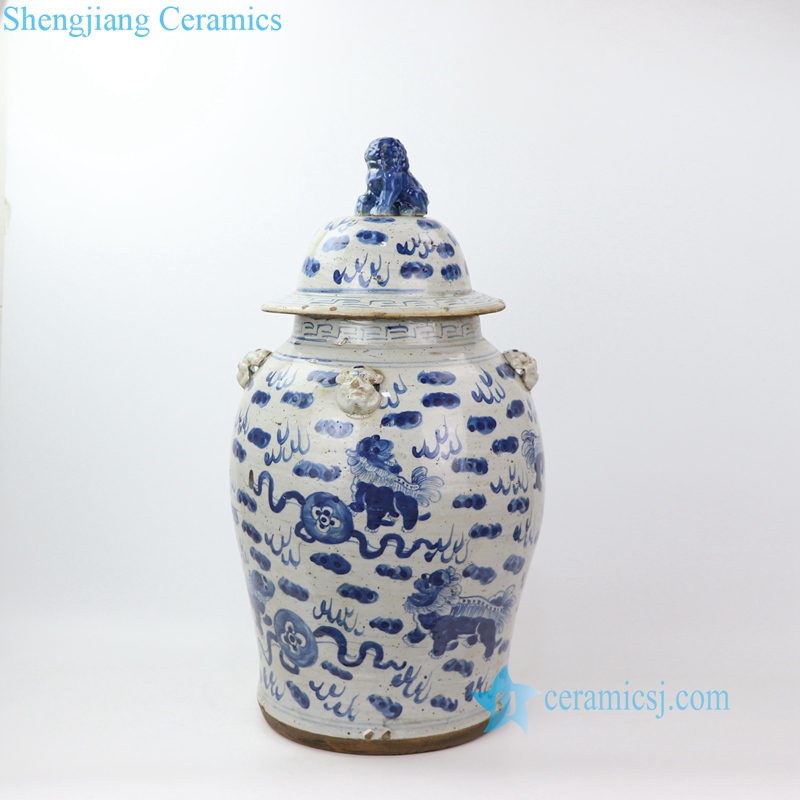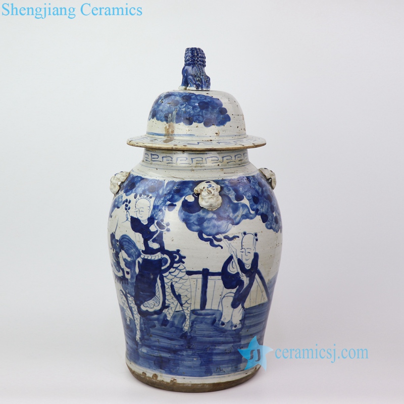 China ancient style dragon and character pattern porcelain jar with blue lion knob