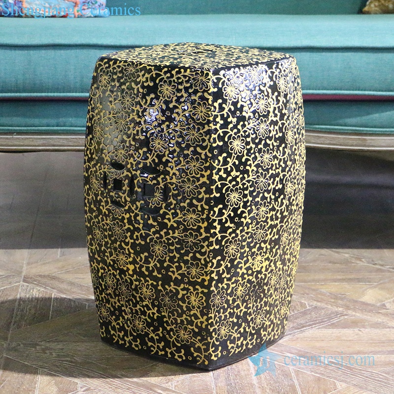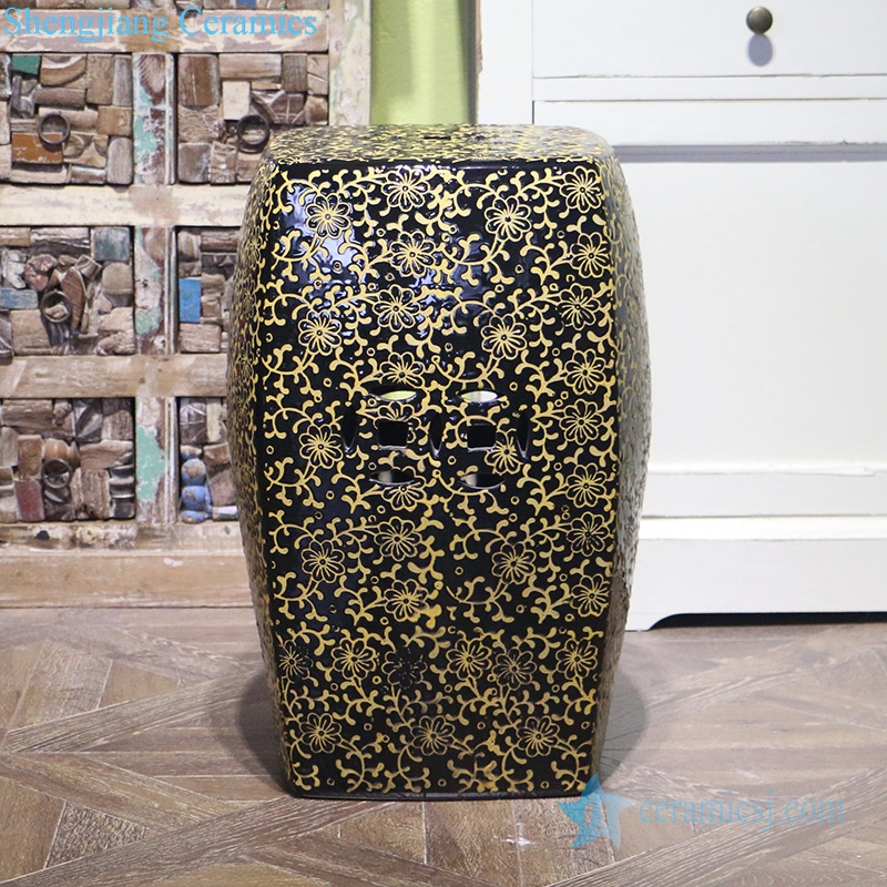 Black background yellow carving flower design porcelain stool |
