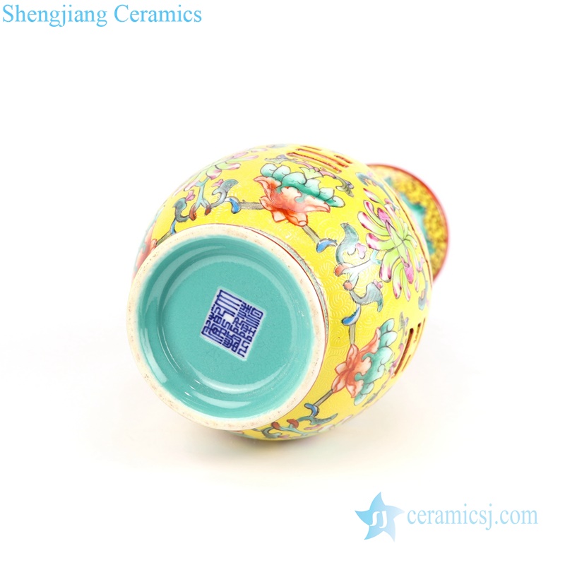 Famille rose carved Qing Dynasty reproduction yellow revolving vase |