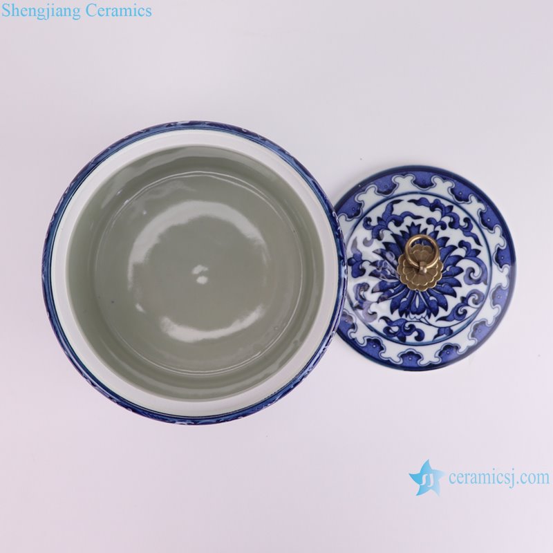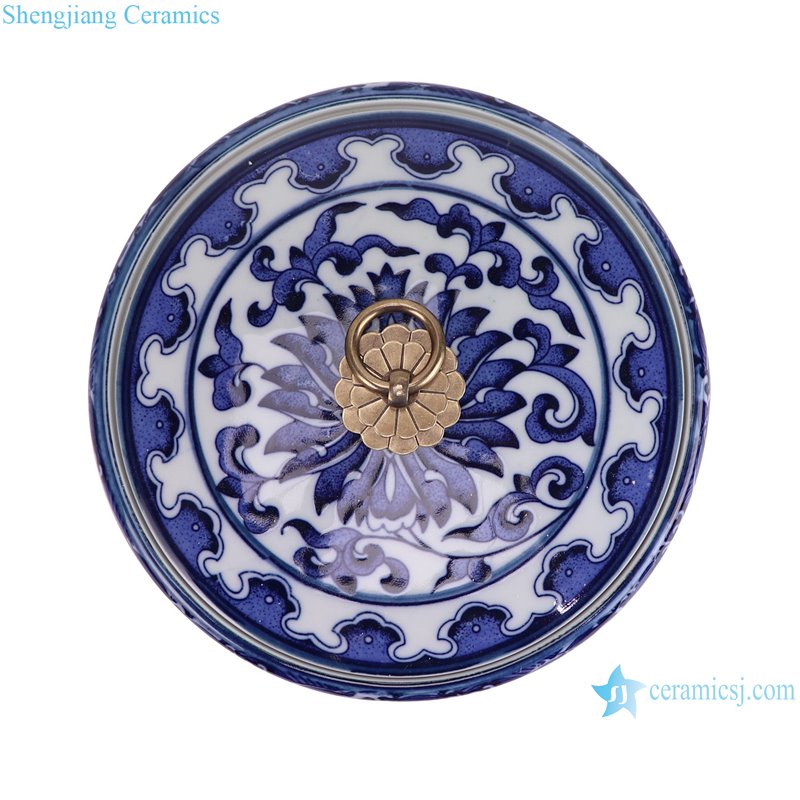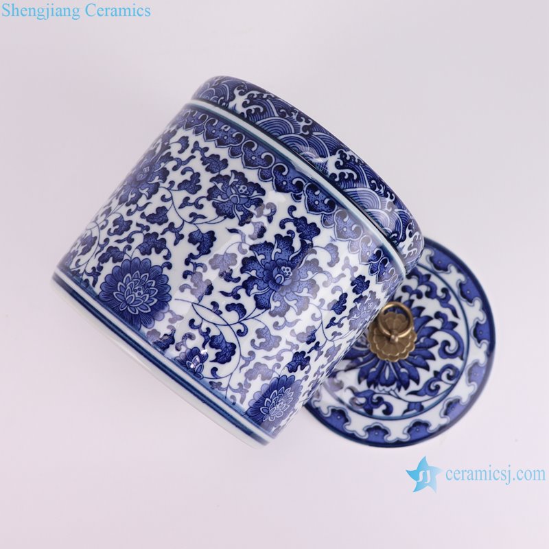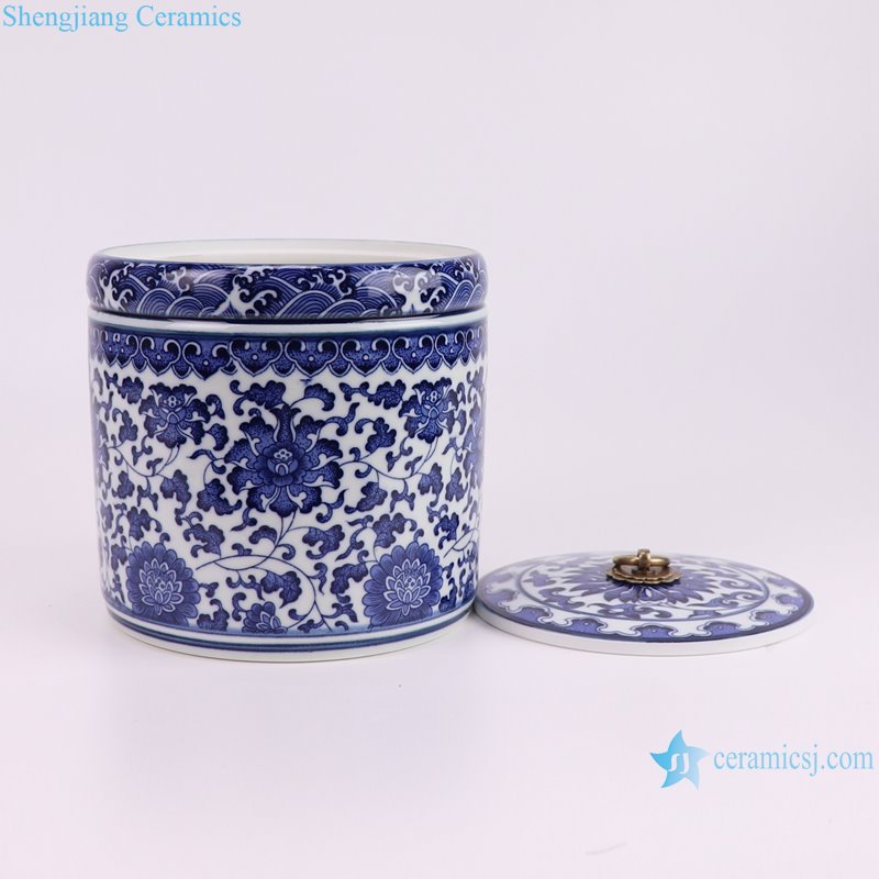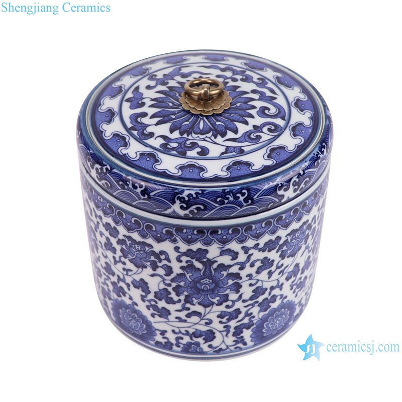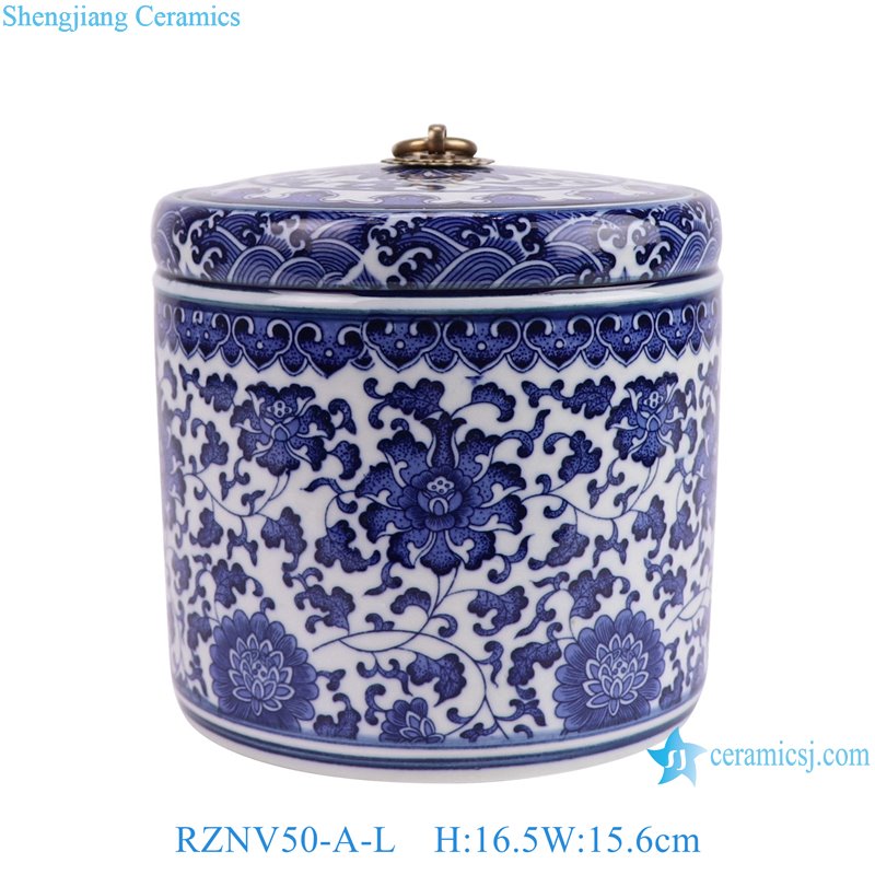 RZNV50-A-L Traditional blue and white lotus pattern with a copper ring lid round straight tube tea can of large size
