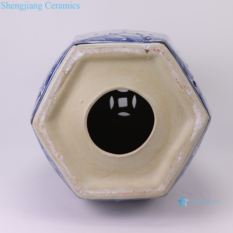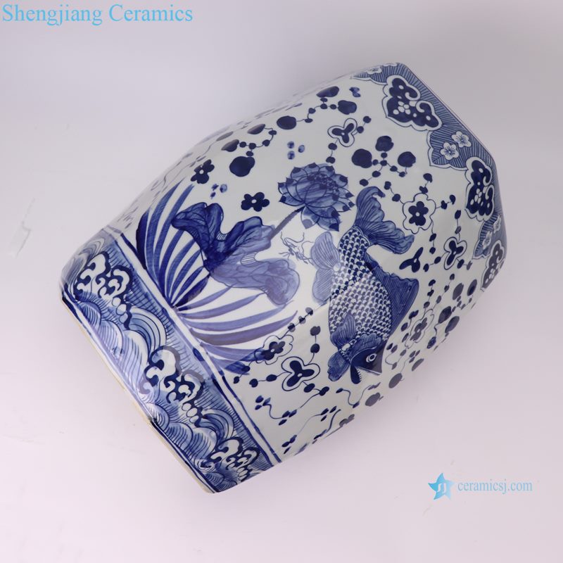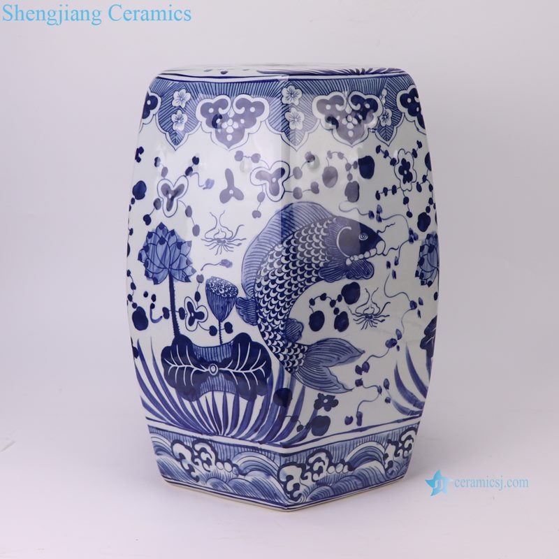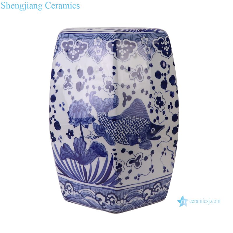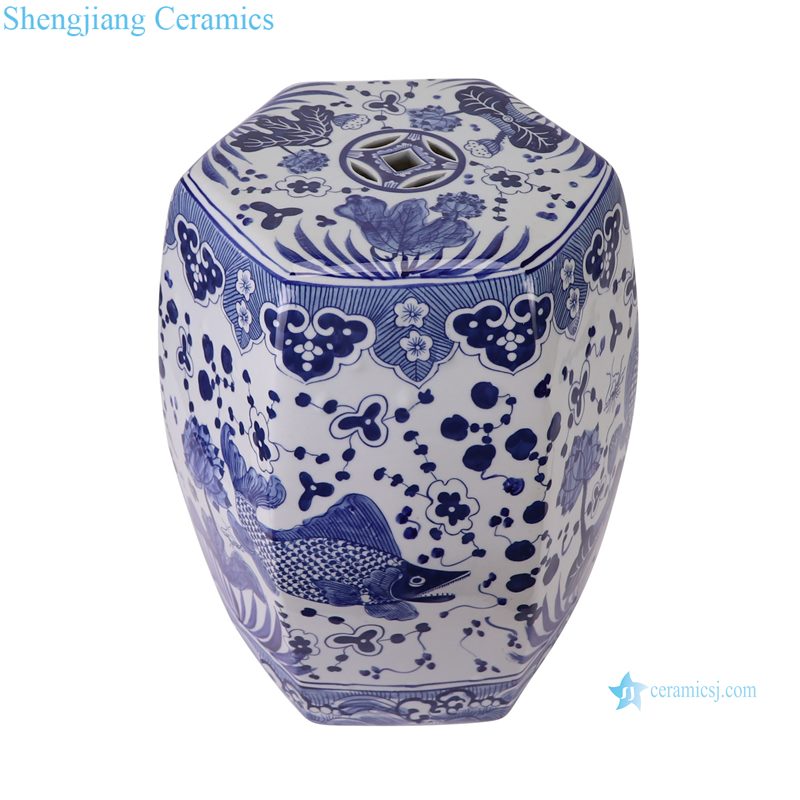 RZSI50-B New Blue and White Fish and Alga Pattern Hexagonal Ceramic Stool Garden Decor