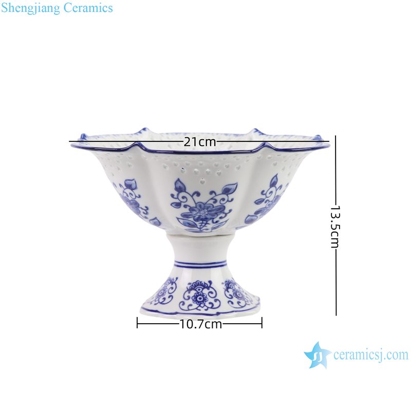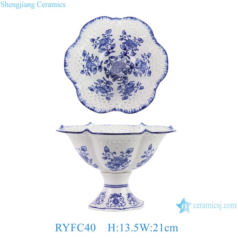 RYFC40 Cheap Price Blue and white Flower Leaf Pattern High Foot Openwork Fruit Plate