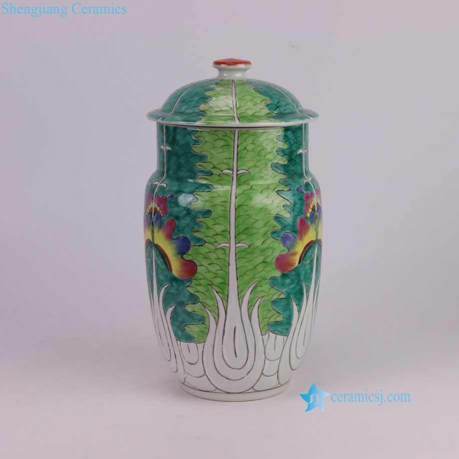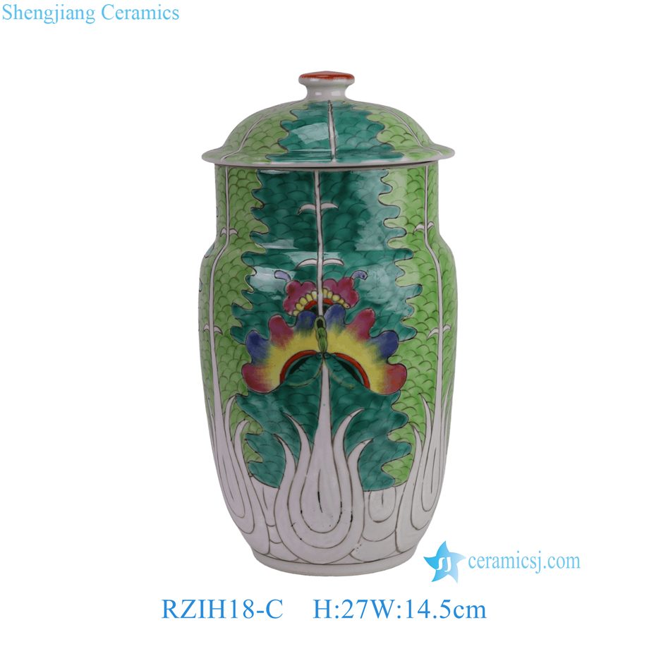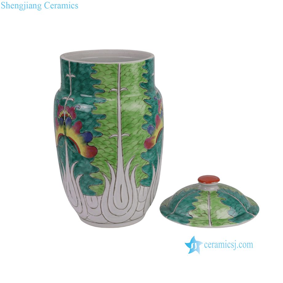 RZIH18-C Vintage Hand-Painted Chinese Butterfly Cabbage Jar Pastel Green Porcelain Lid Jar Botanical Decorative Vase