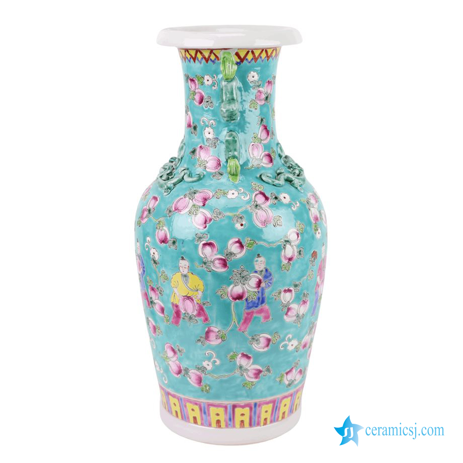 RYZG36-C-D Antique Chinoiserie Famille Rose Green-Ground Vase with Peach Boy Kylin Motifs Deer-Ear Handles