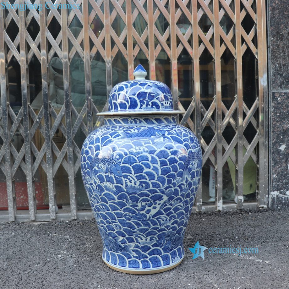 RYKB205-A Big Size Blue and White Fish Sea Water Motif Lion-head Porcelain Temple Jar for Home Decor Hotel Villa