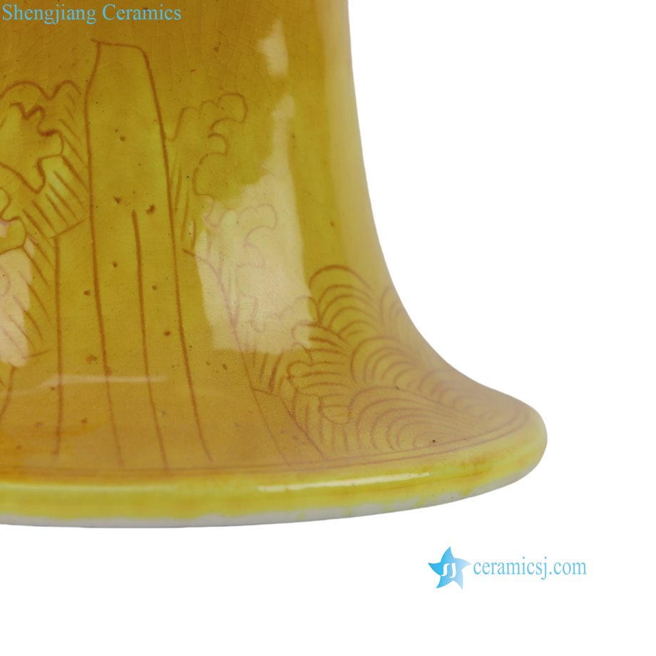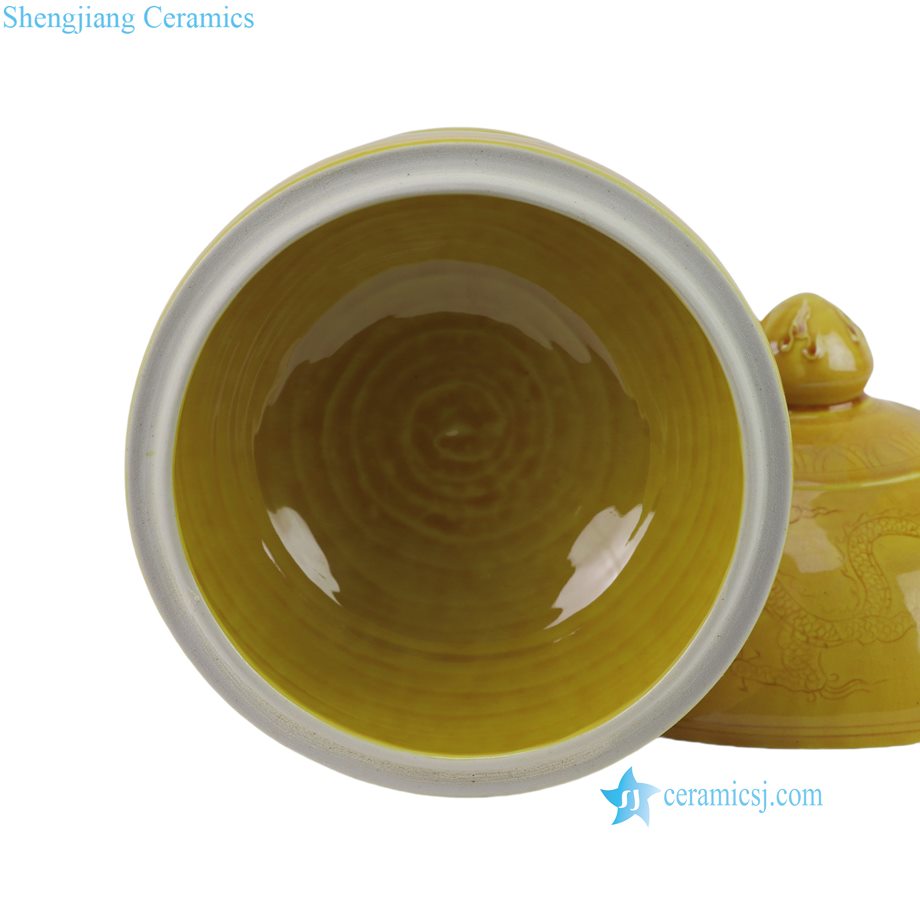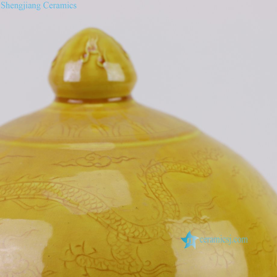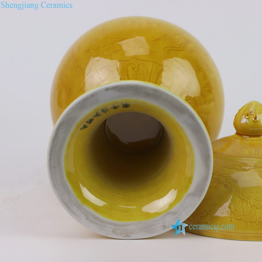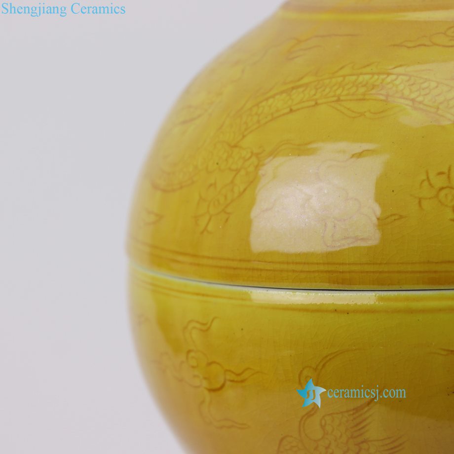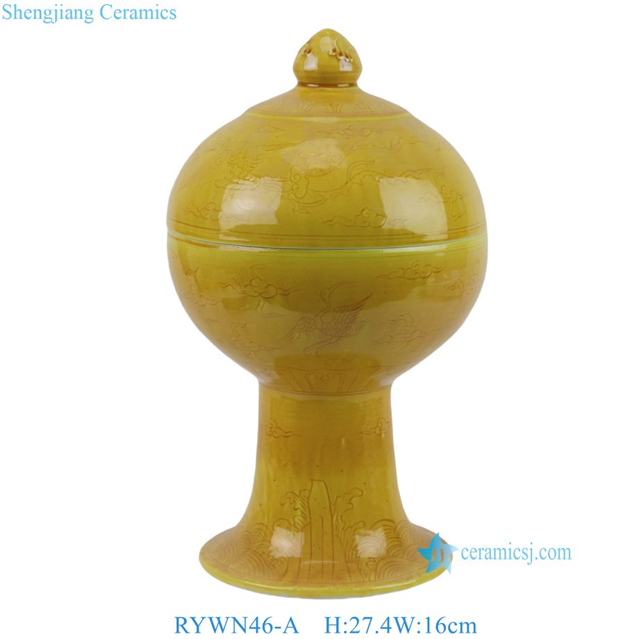 RYWN46-A Vintage Ming Dynasty Yellow Glaze Carved Crane Pattern High-Footed Lidded Jar for Collections Home Decor