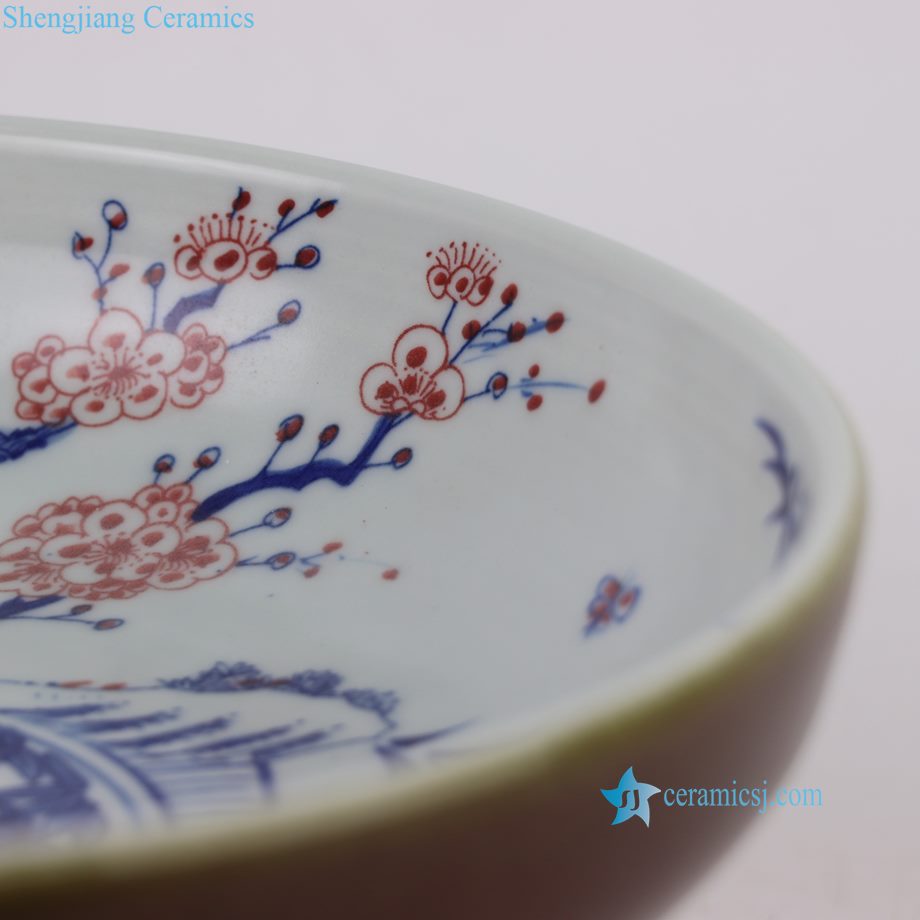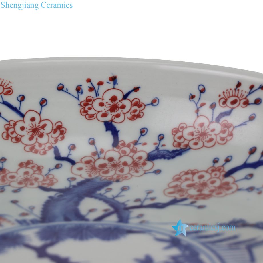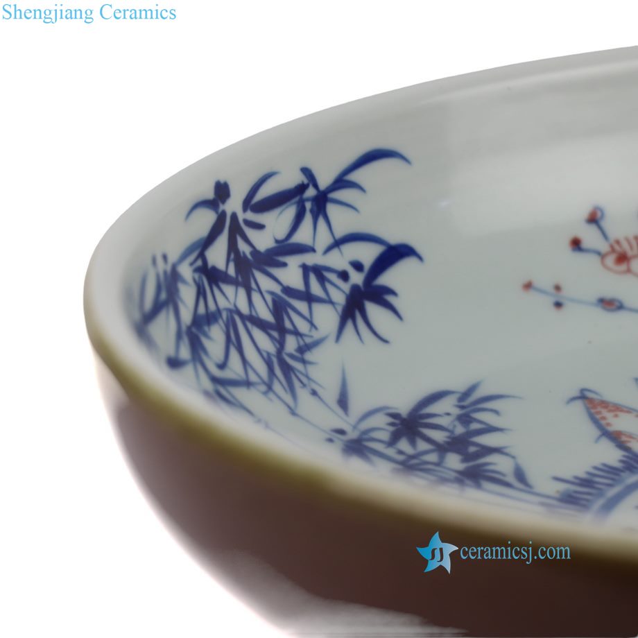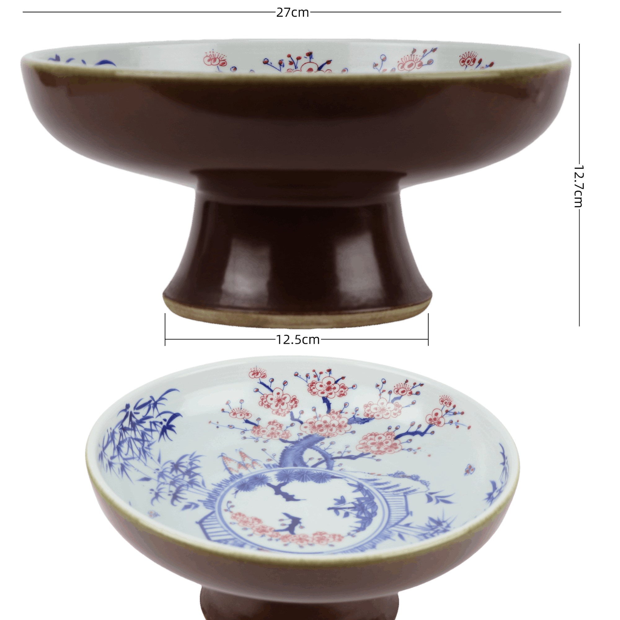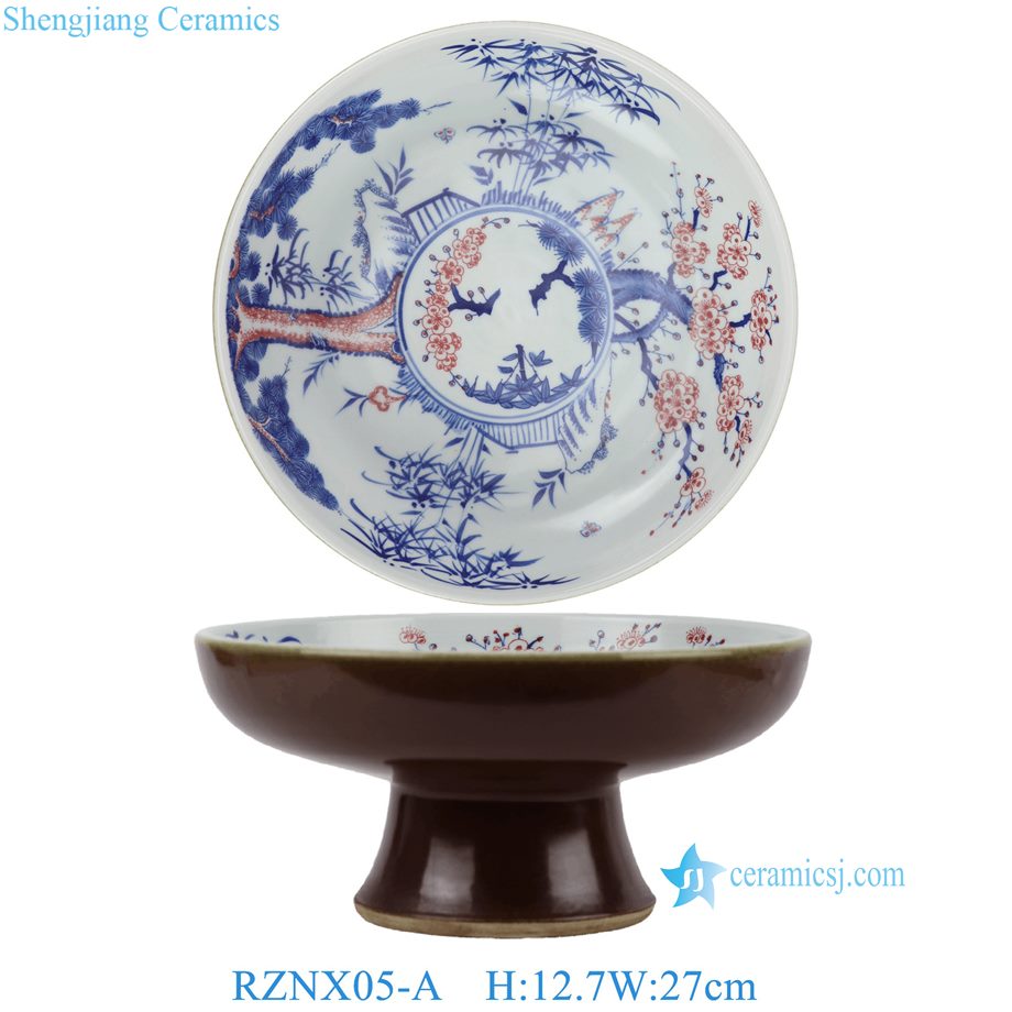 RZNX05-A Hand Painted Blue and White with Underglaze Red Pine-Bamboo-Plum Pedestal Fruit Plate