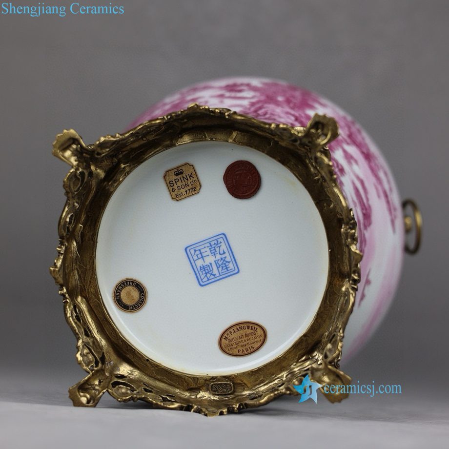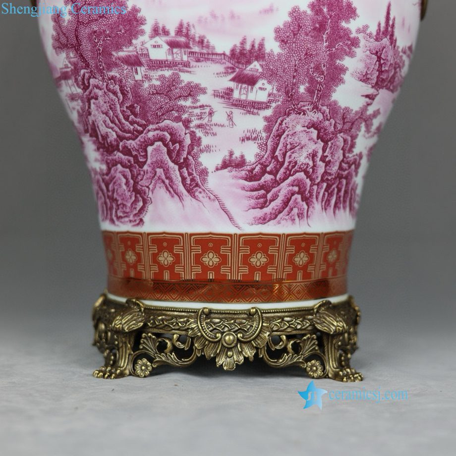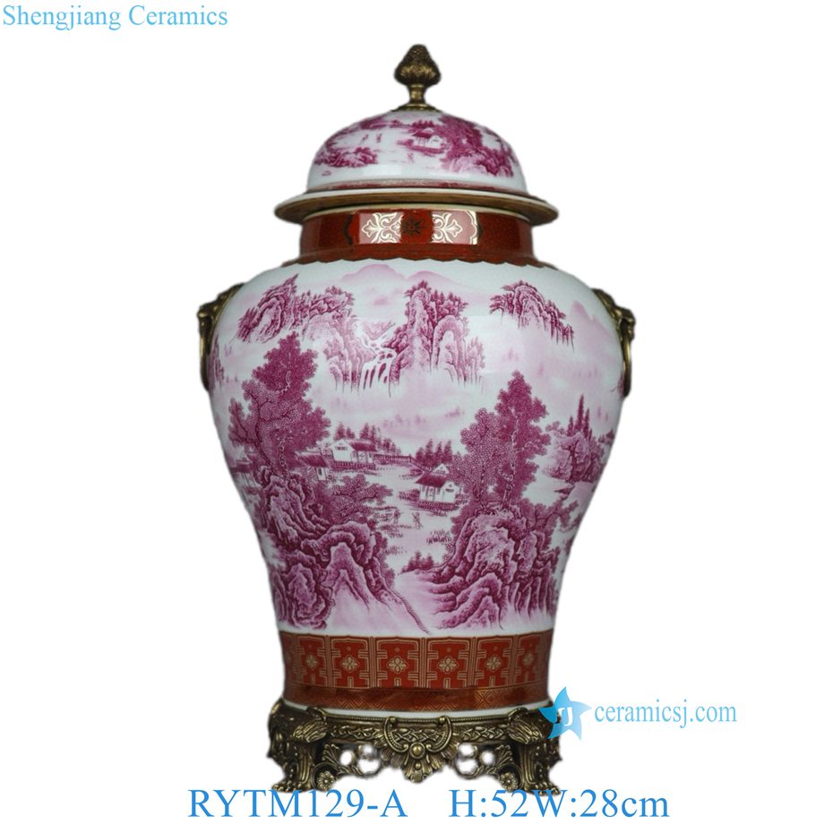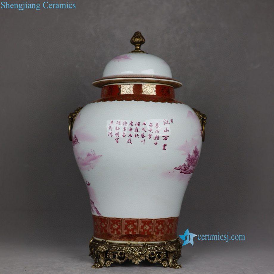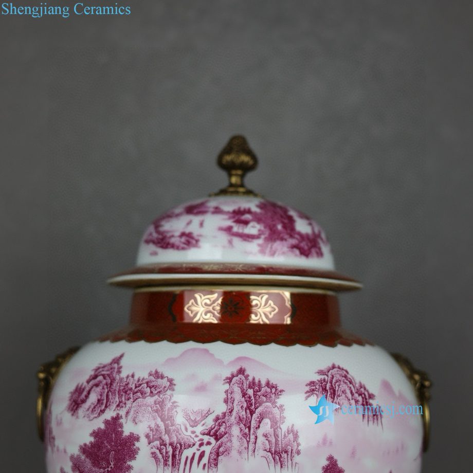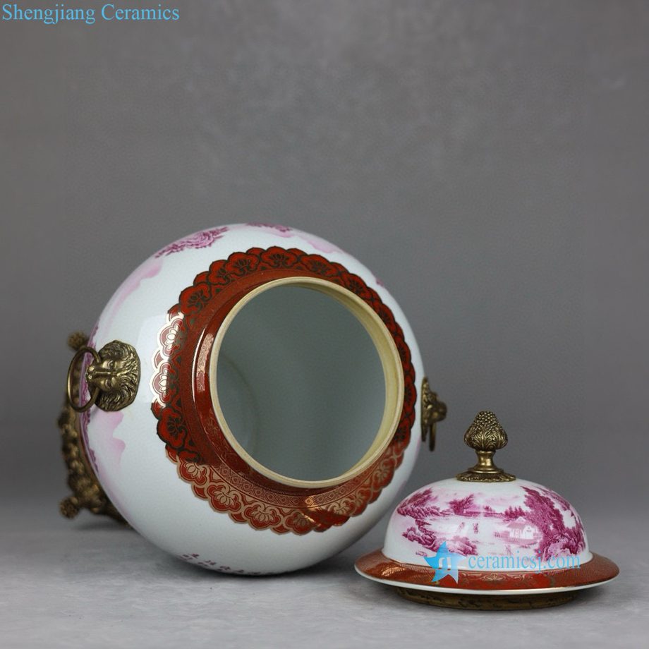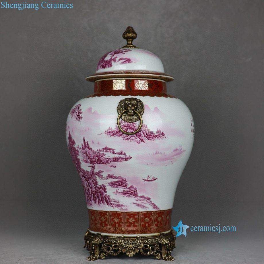RYTM129-A Famille Rose Rouge Porcelain General’s Jar with Gilt Landscape Painting and Twin Copper Lion Ring Handles