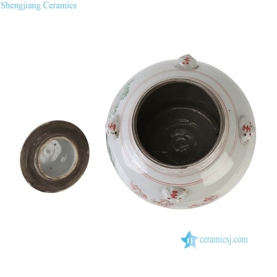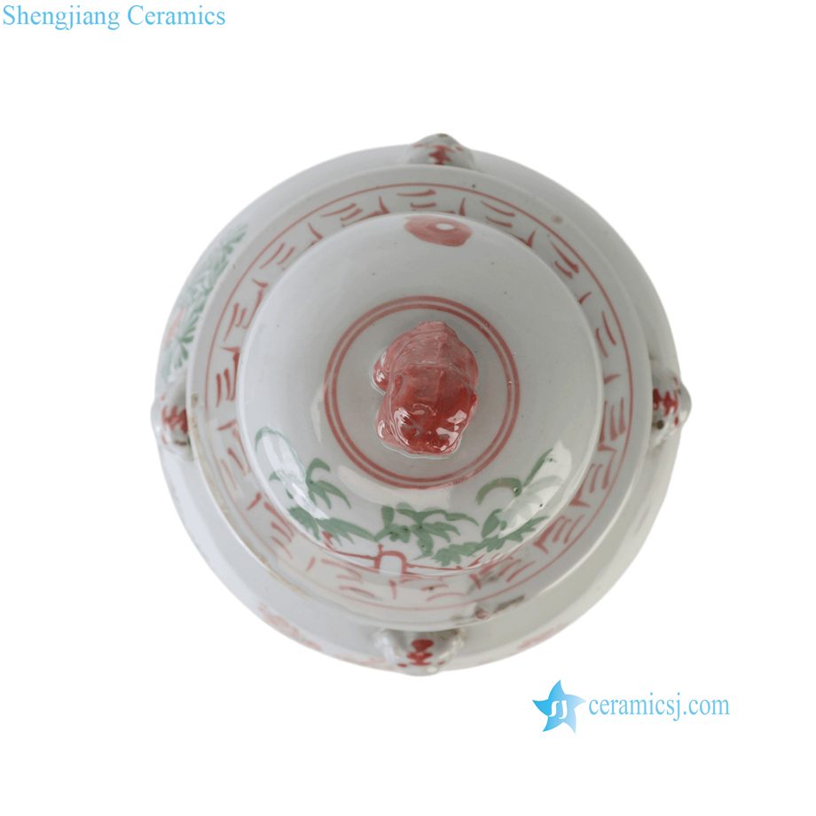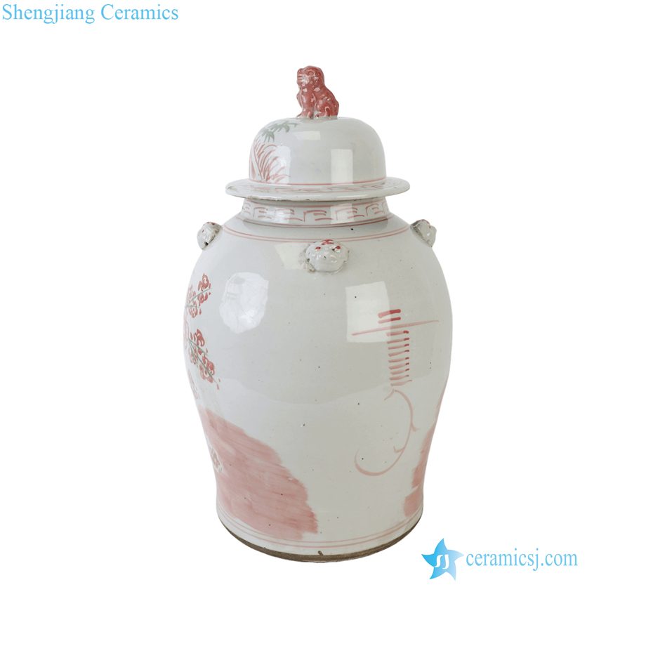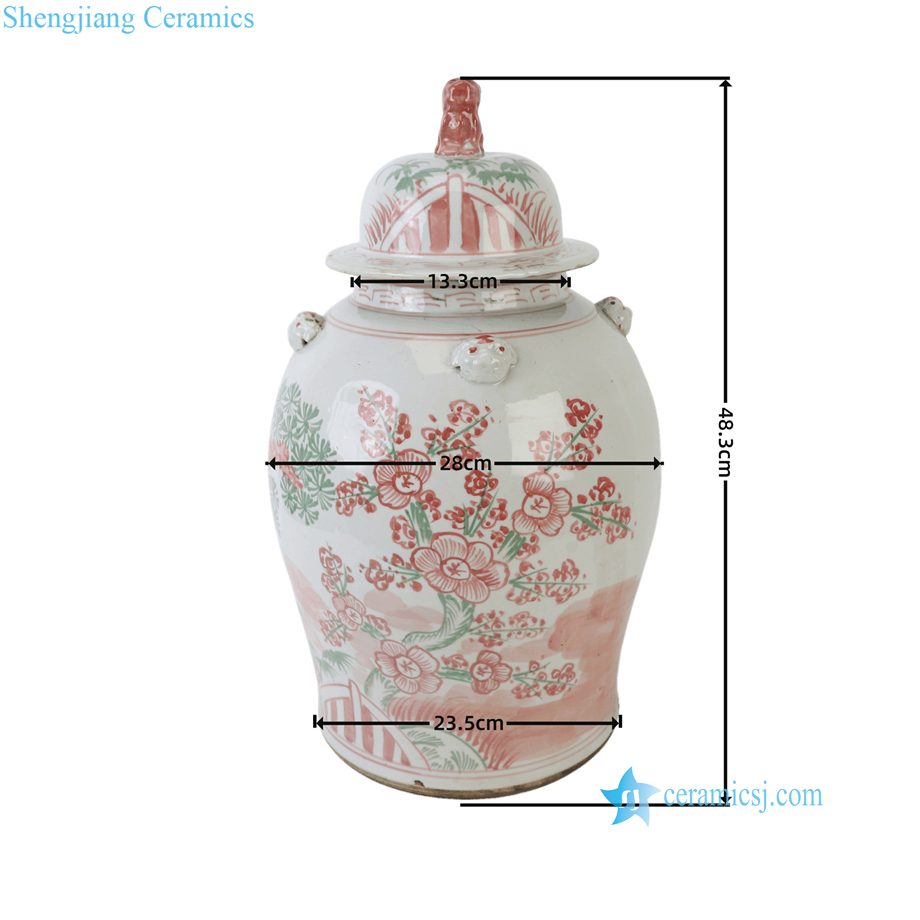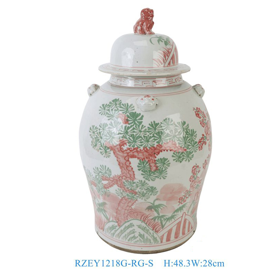 RZEY1218G-RG-S Unique Antique Style Chinese Ceramic Ginger Jar with Pine, Bamboo, Plum and Foo Dog Lid