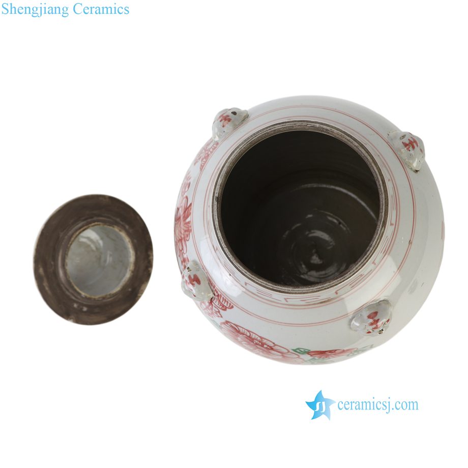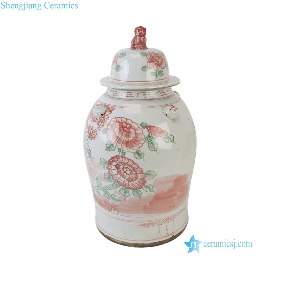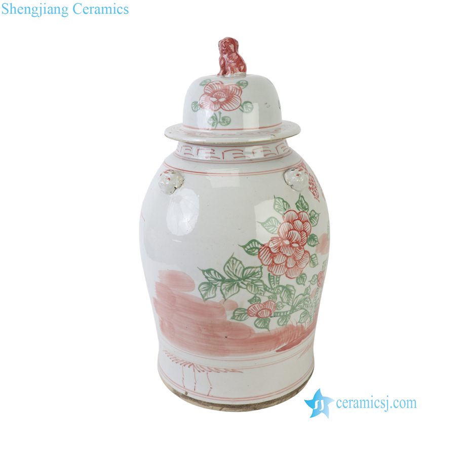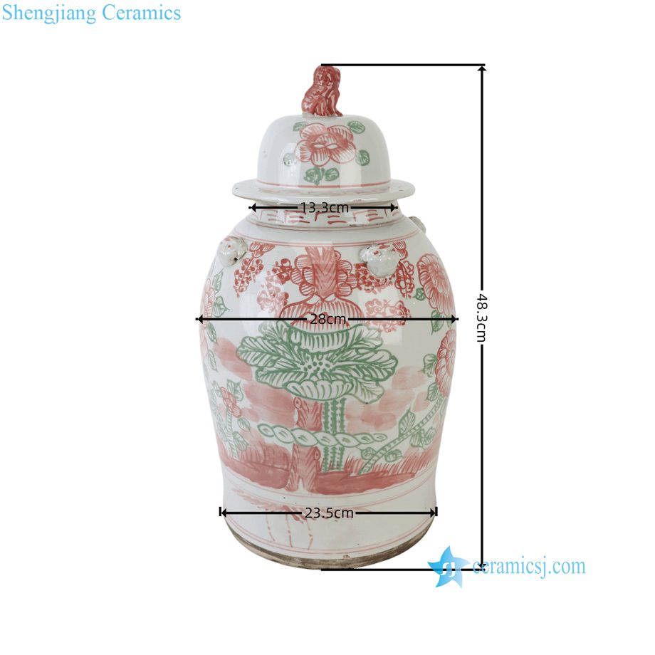 RZEY1218H-RG-S Vintage Chinese Red & Green Famille Verte Temple Jar with Four Seasons Floral Motif and Foo Dog Lid Finial