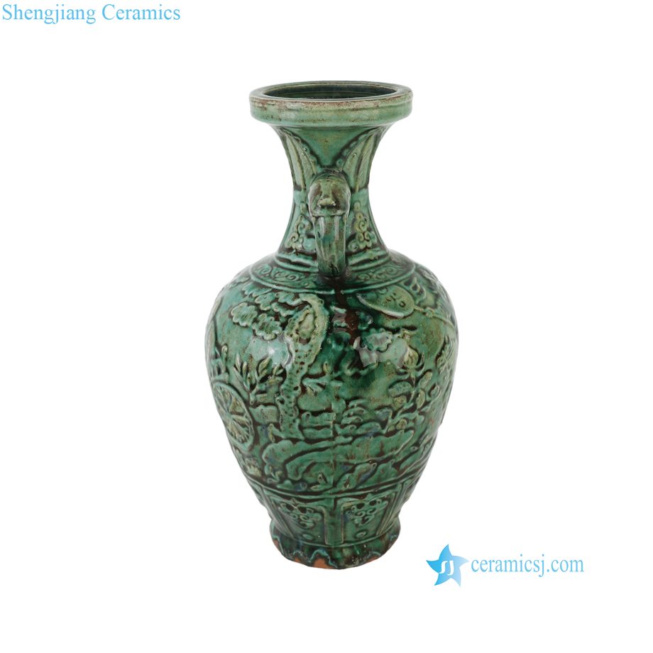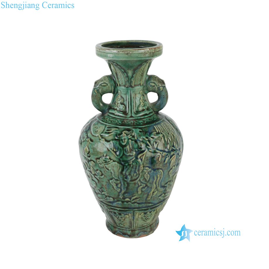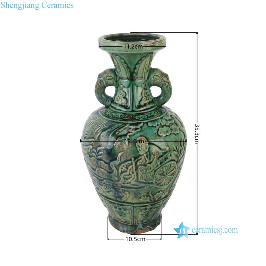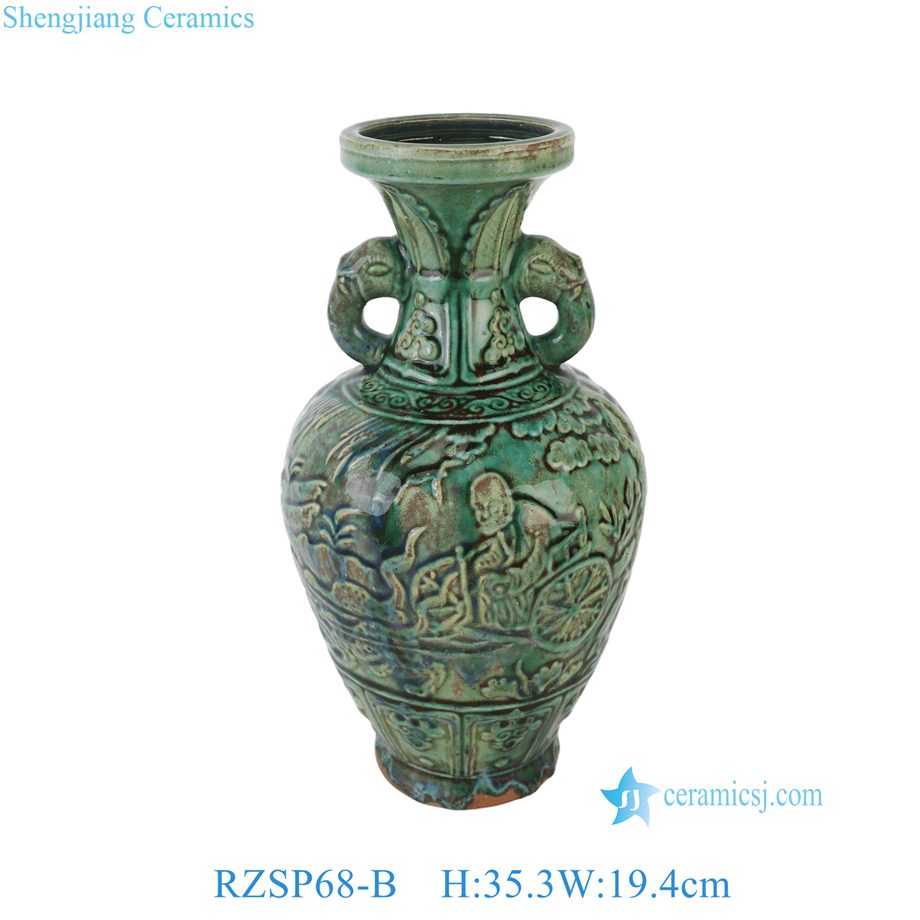 RZSP68-B Jingdezhen Antique Speckled Green Carved Warrior Ceramic Vase with Ear Handle