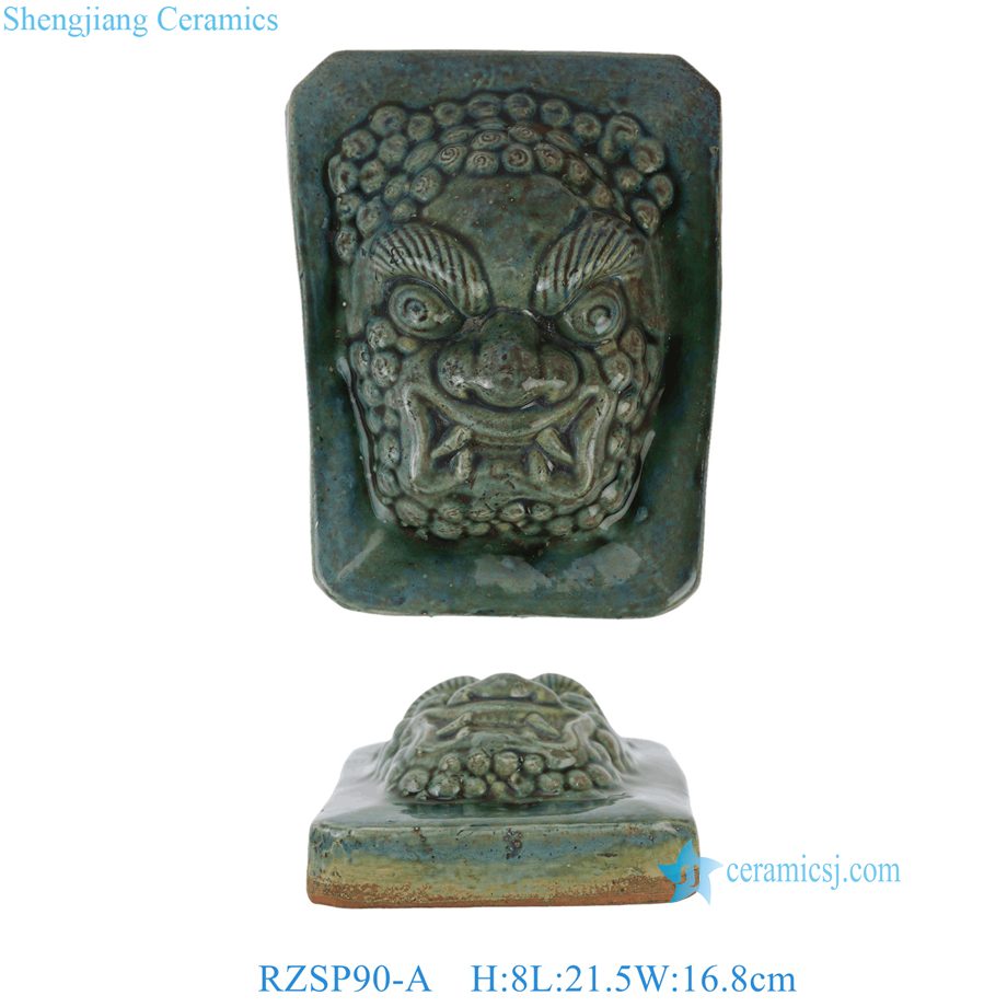 RZSP90-A Old China Antique Green Ceramic Lion Head On Wall Hang Statue Rectangular Wall Plaque