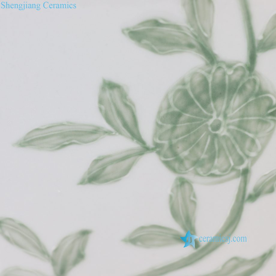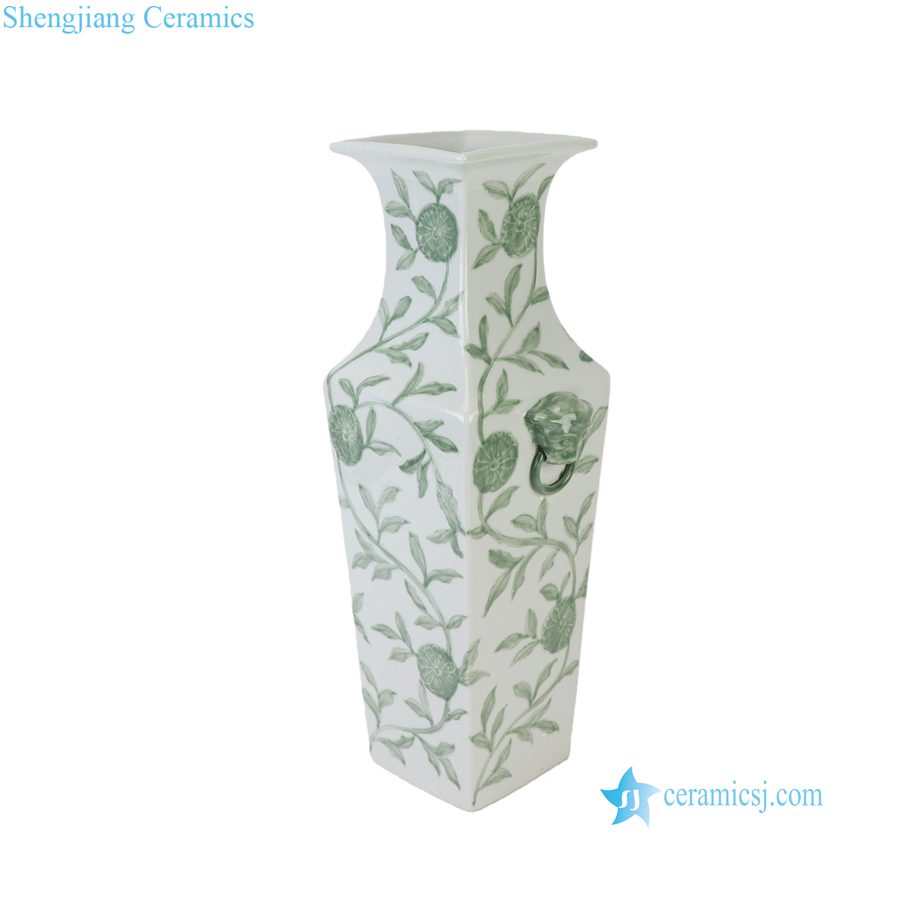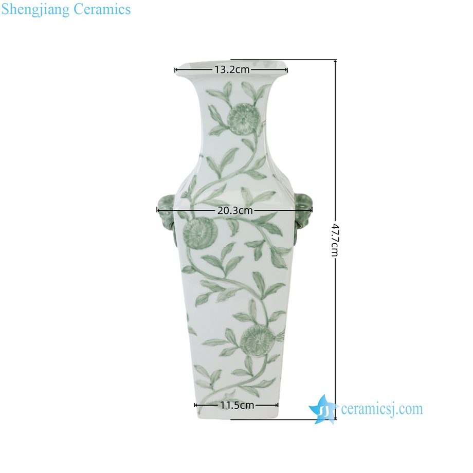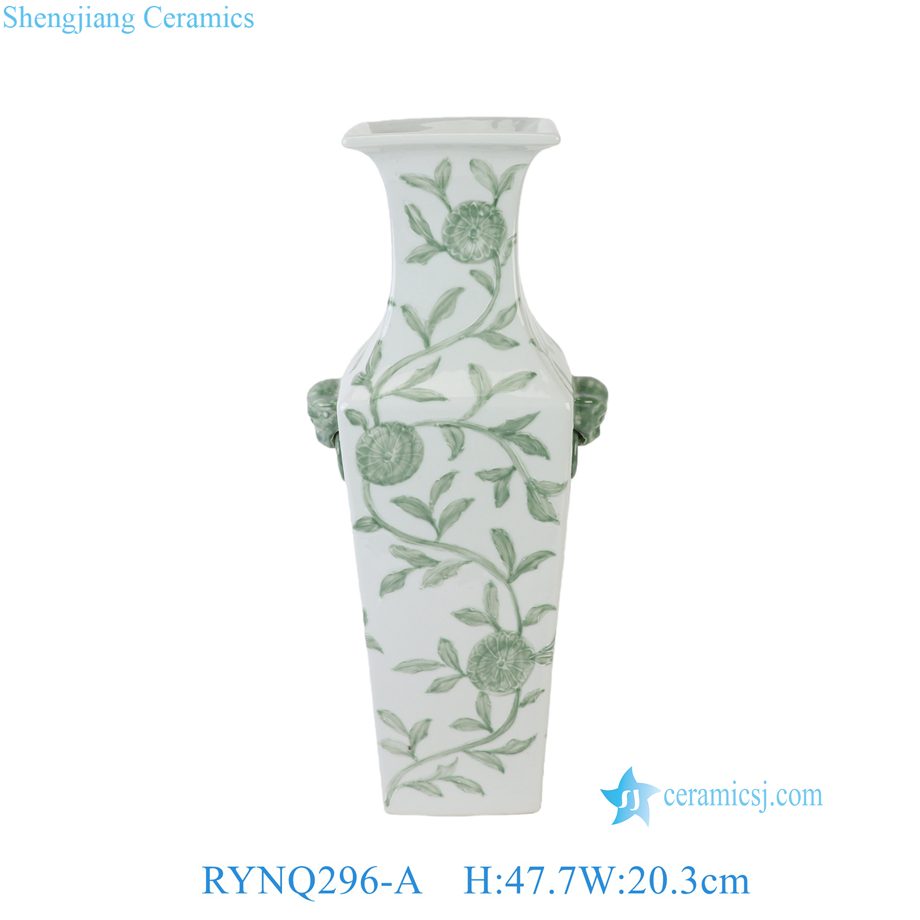 RYNQ296-A Jingdezhen Green White Porcelain Square Vase with Green Floral Relief and Beast Head Handles