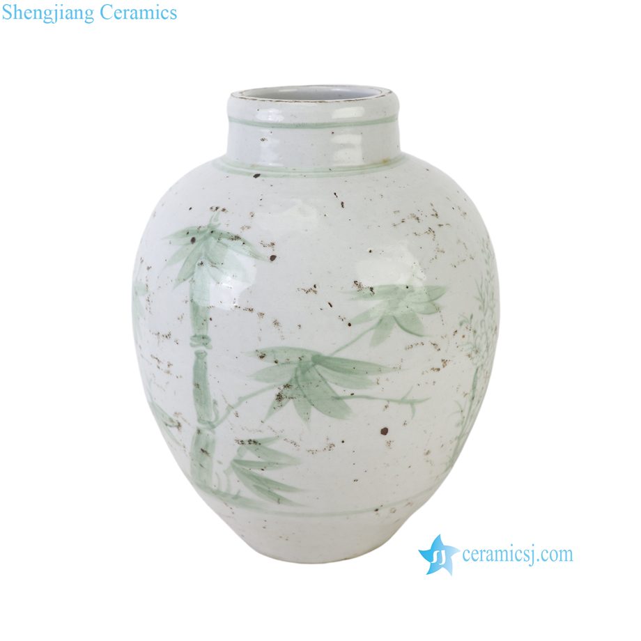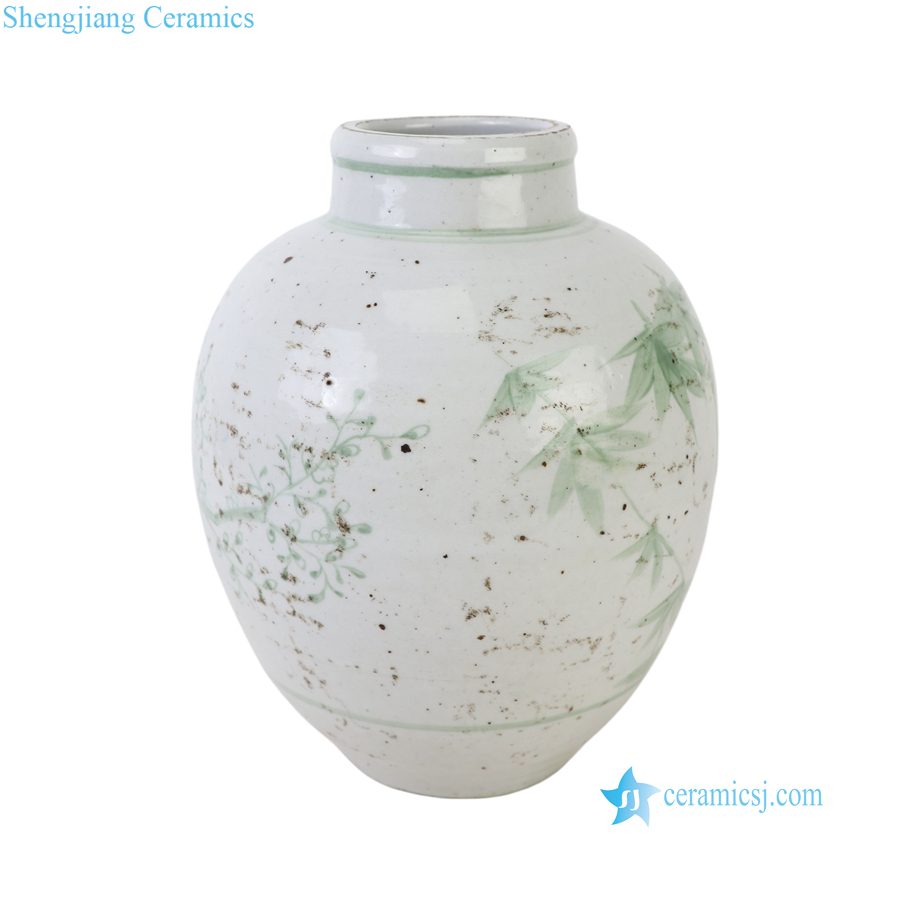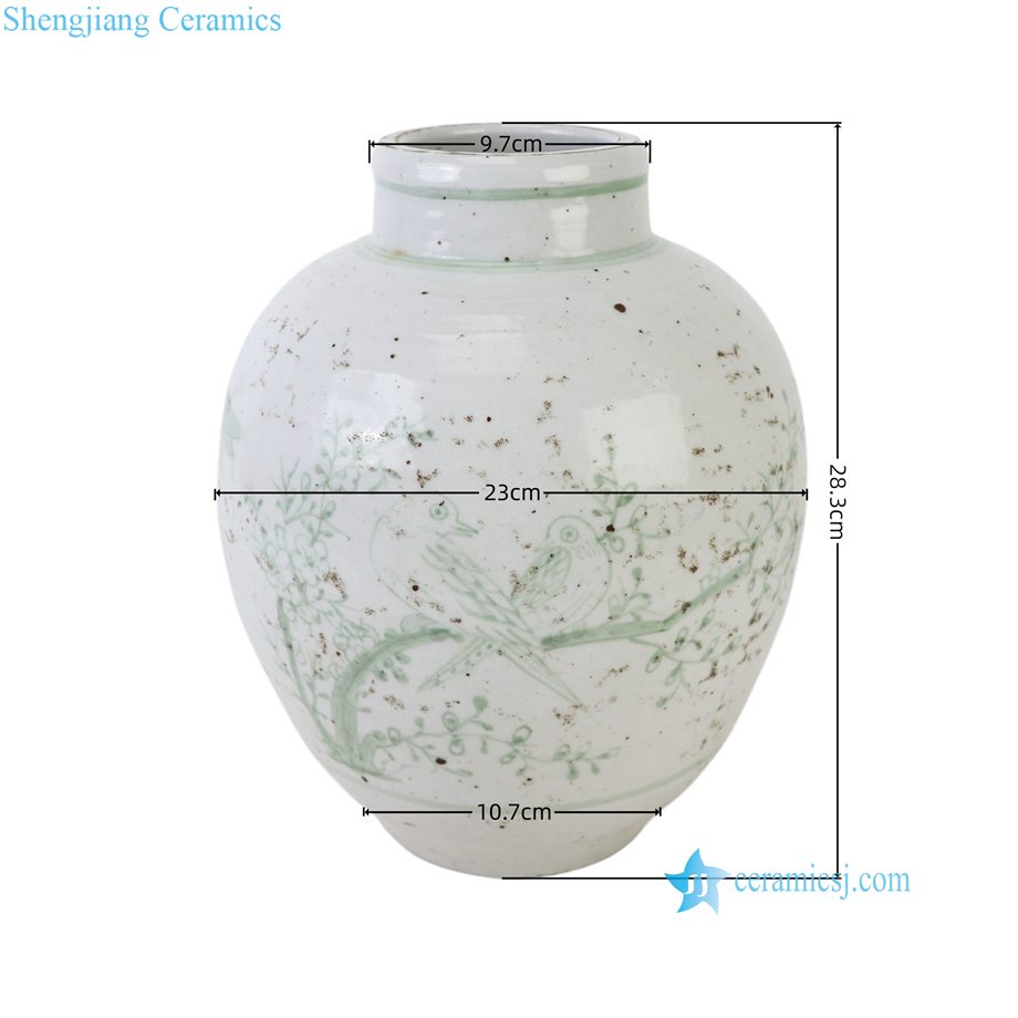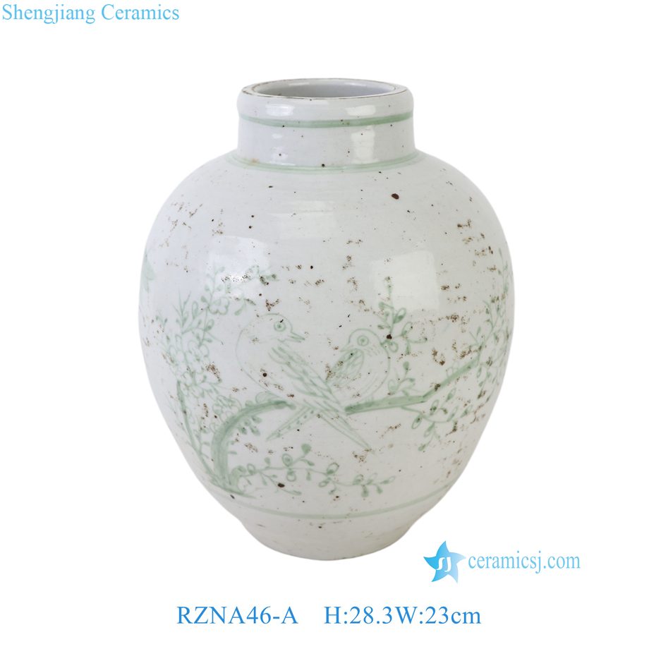RZNA46-A New Hand Painted Rustic White Porcelain Ginger Jar Vase with Green Hand-Painted Bird and Flower Motif