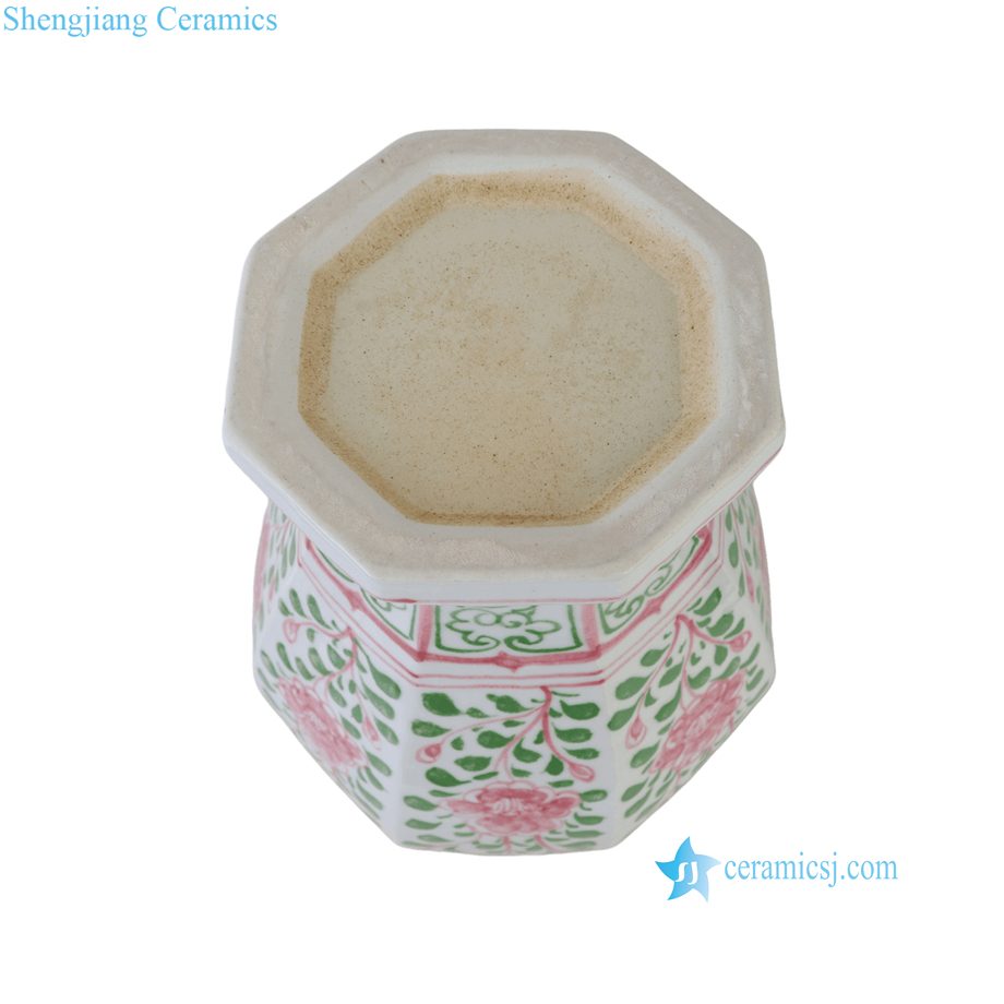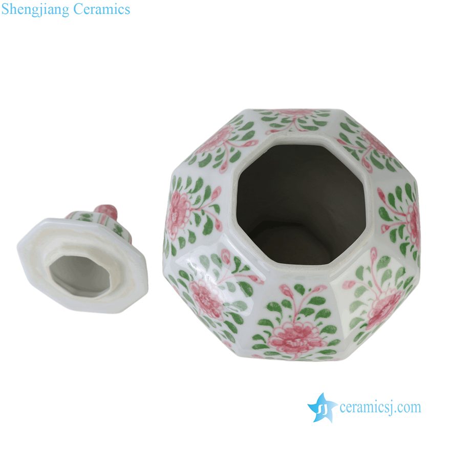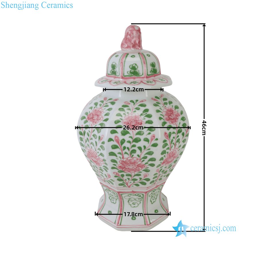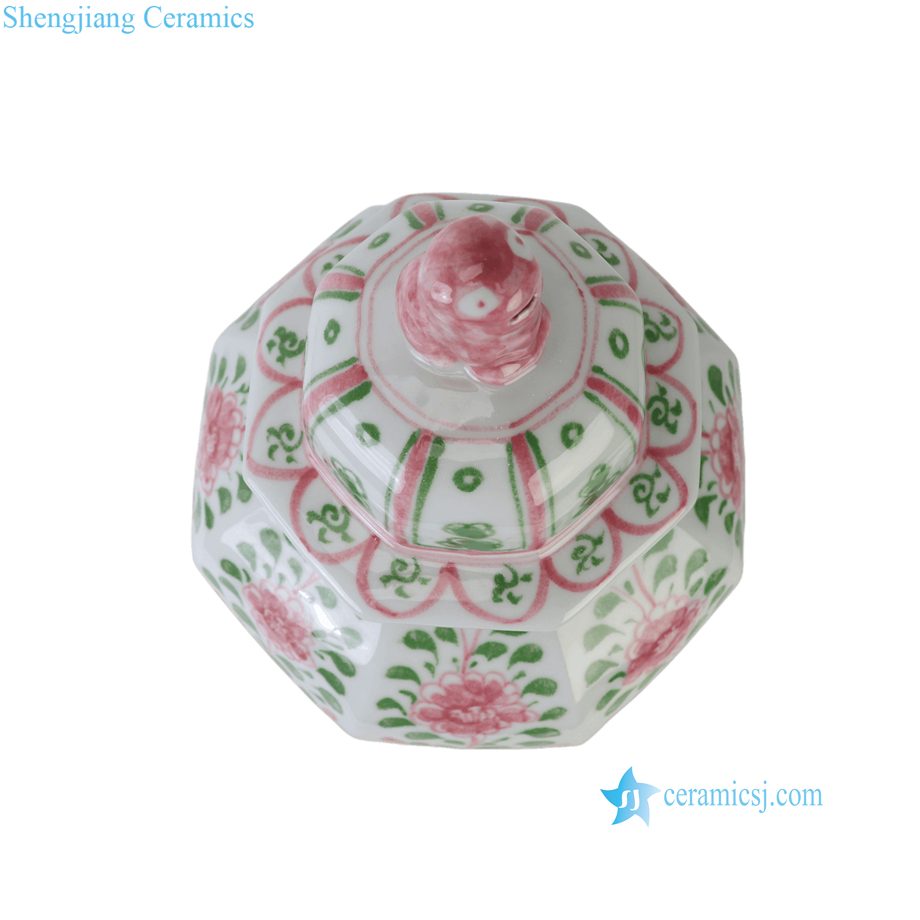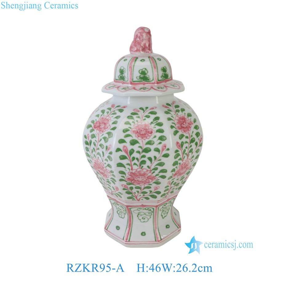 RZKR95-A Jingdezhen Hand Painted Chinoiserie Pink Green Floral Octagonal Ceramic Lidded Ginger Jar with Foo Dog Top