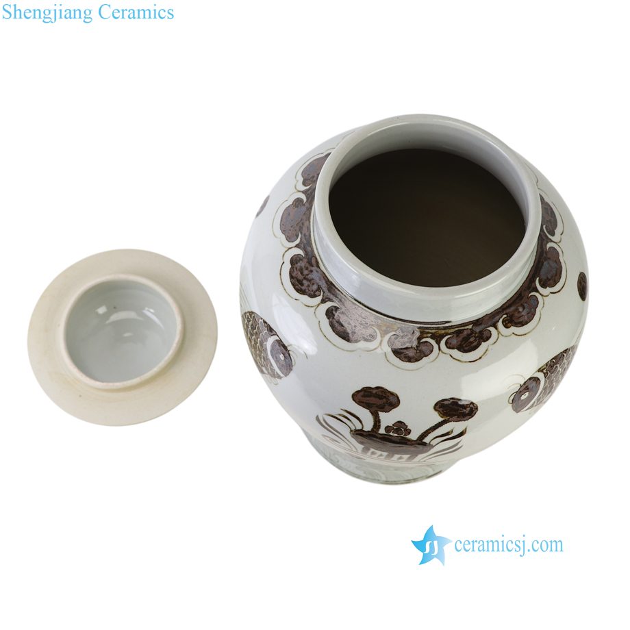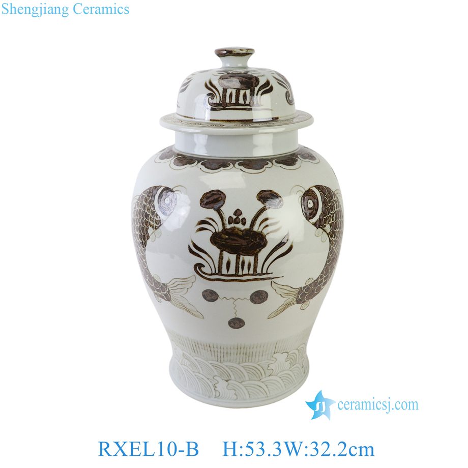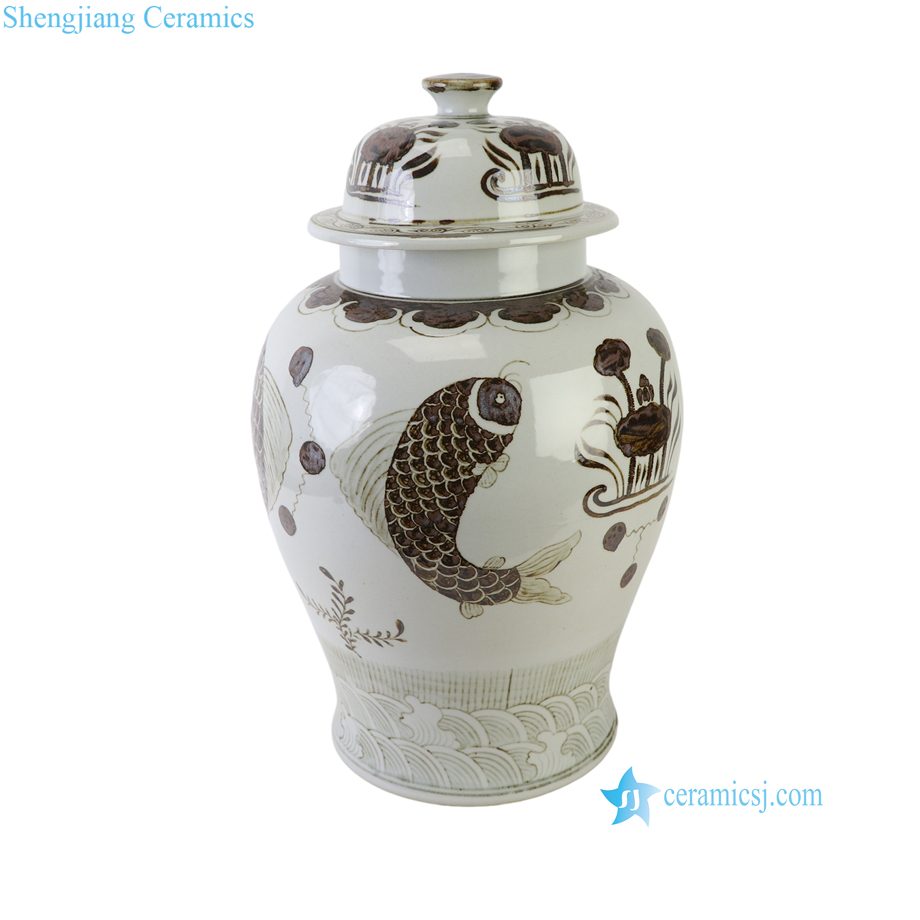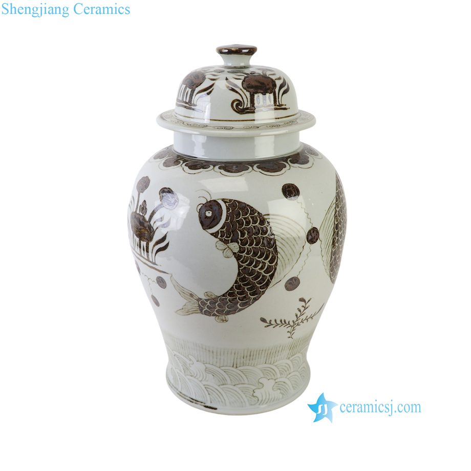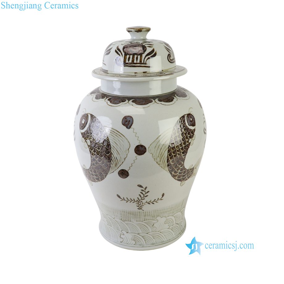 RXEL10-B Brown and White Hongwu Style Fish Pattern Ceramic Temple Jar Lidded Pot